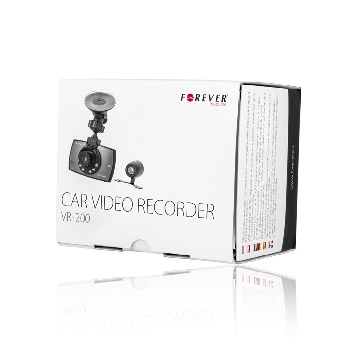 Kamera do auta FOREVER VR-200 je vybavena snímačem, který umožňuje nahrávání v Full HD rozlišení ( 1920 x 1080 ). Kamera zaznamenává videa na paměťové karty microSD až do kapacity 32GB. Součástí kamery je 2.7"LCD displej a druhá kamera pro nahrávání v zadní části automobilu.