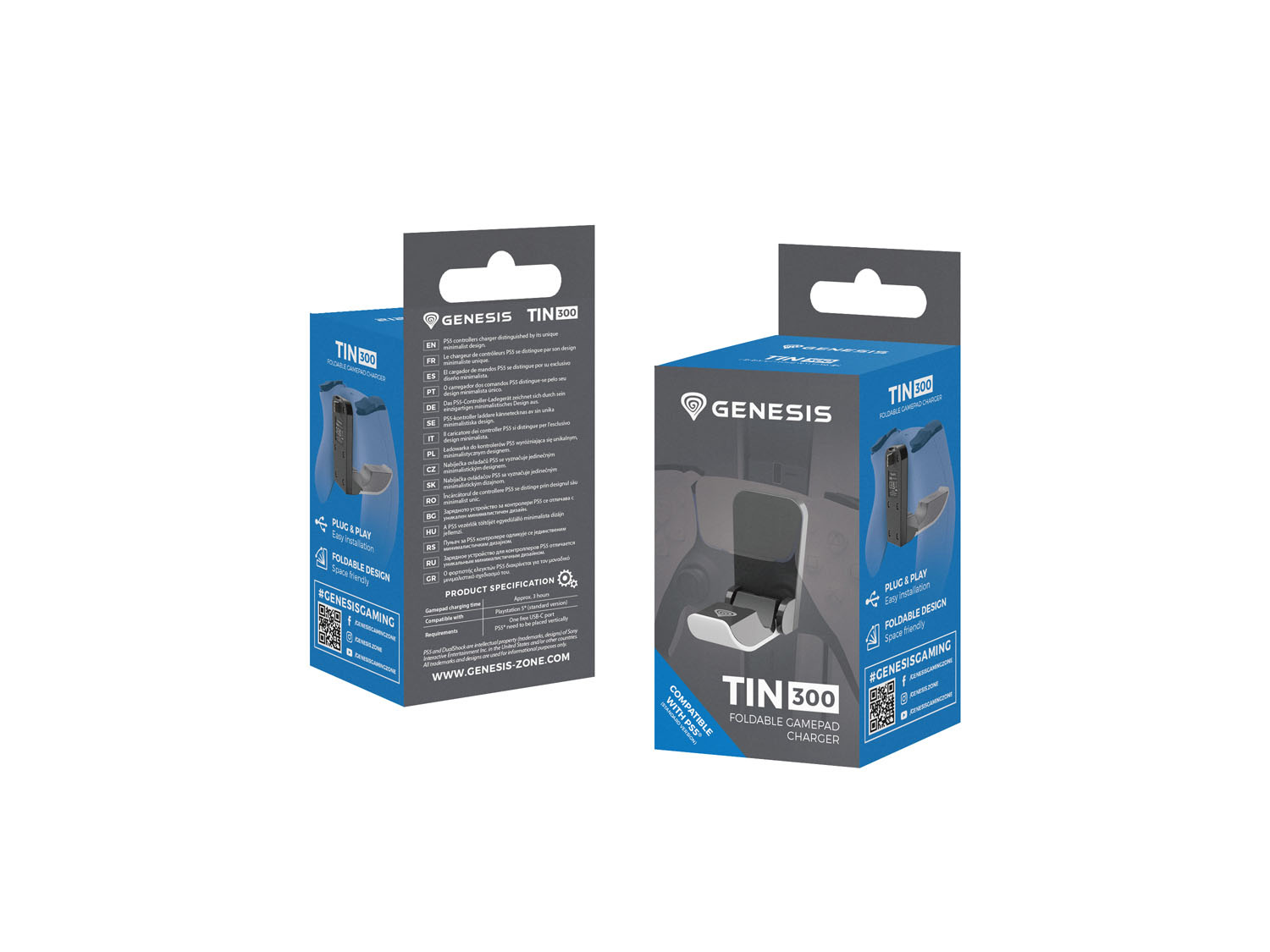 Seznamte se s GENESIS Tin 300 - nabíječkou kompatibilní se standardní verzí konzole PS5, s níž můžete snadno doplnit energii do gamepadů DualSense a DualSense Edge. Jednoduchá, plně skládací konstrukce, kvalitní materiály a nadčasový design - buďte kdykoli připraveni hrát.