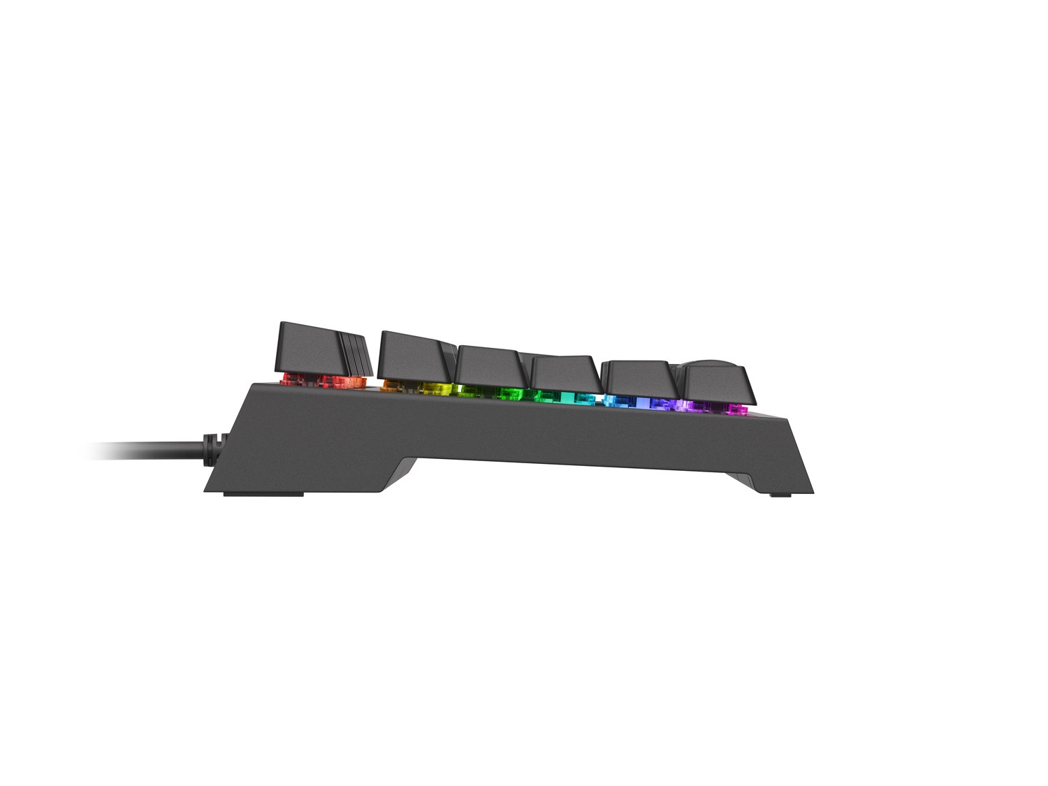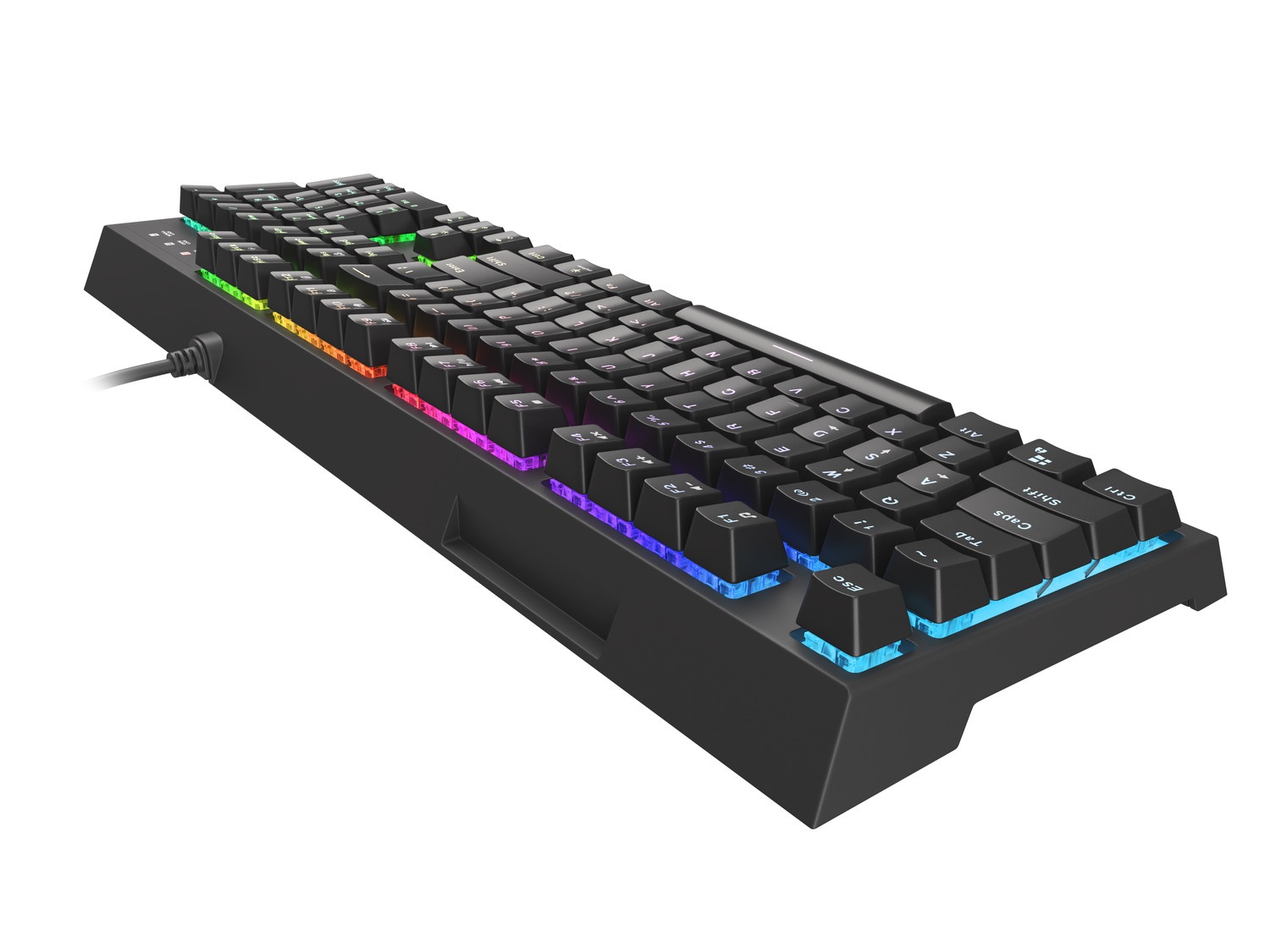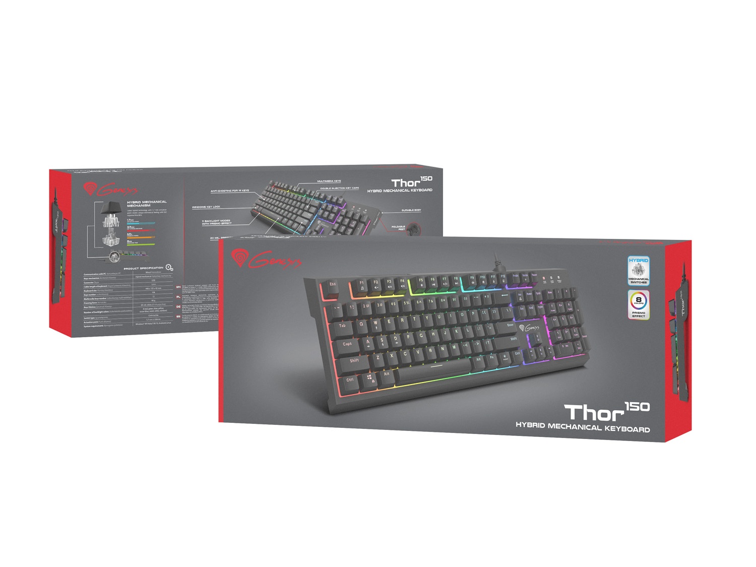 Herní klávesnice Genesis THOR 150 RGB. Dokončete svůj herní set klávesnicí s plným barevným spektrem a jedinečným efektem RGB. Thor 150 má 7 zón RGB podsvícení s 11 režimy a 8 předdefinovanými barvami včetně duhového režimu. Od této chvíle bude vaše nastavení dynamické a jedinečné a potěší oko každého herního fanouška.