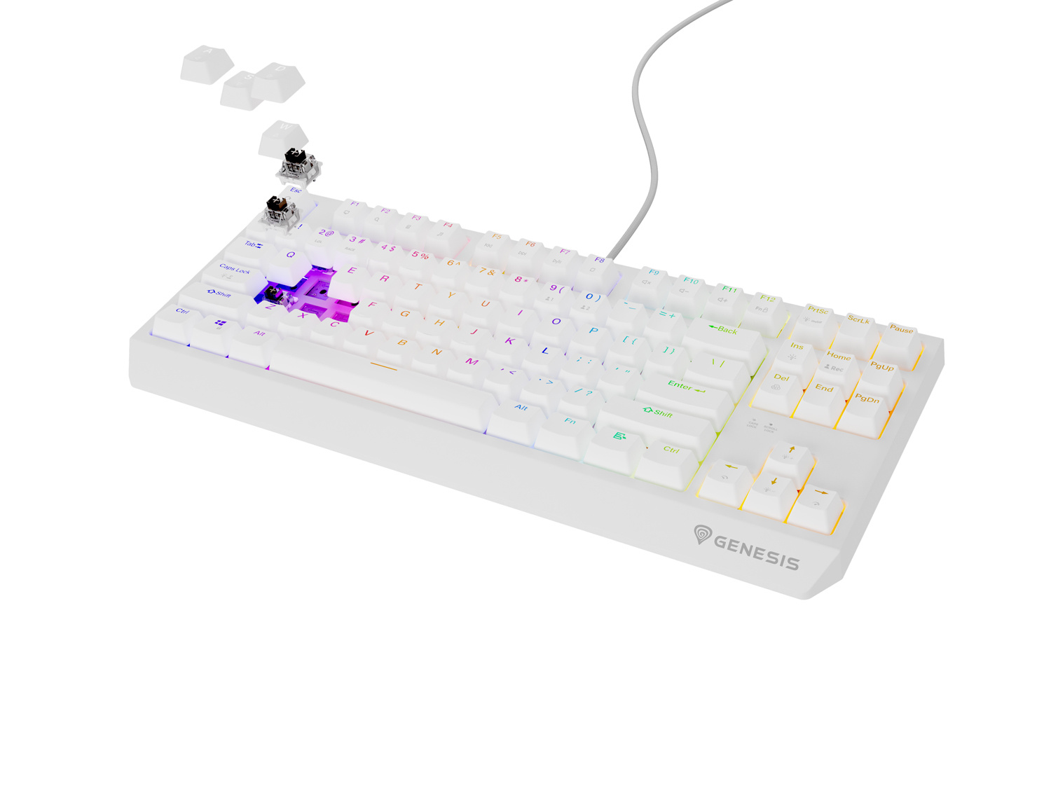 Klávesnici Genesis Thor 230 TKL jsme vybavili lineárními spínači Outemu Brown, které vynikají vysokou přesností, aktivací bez ohledu na místo stisknutí klávesy a vysokou dynamikou. Víme však, že jako hráč můžete mít své vlastní preference. Proto jsme do Genesis Thor 230 TKL implementovali Hot Swap - techniku, která vám umožní nahradit jakýkoli třípinový mechanismus mikrospínačem od společností jako Outemu, Akko, KTT. Jednoduše vytáhněte nainstalovaný mechanismus a zapojte nový. Díky systému Hot Swap také nemusíte kupovat novou klávesnici, když jeden spínač selže. Vyměníte jej během několika sekund. Je to jednoduché.