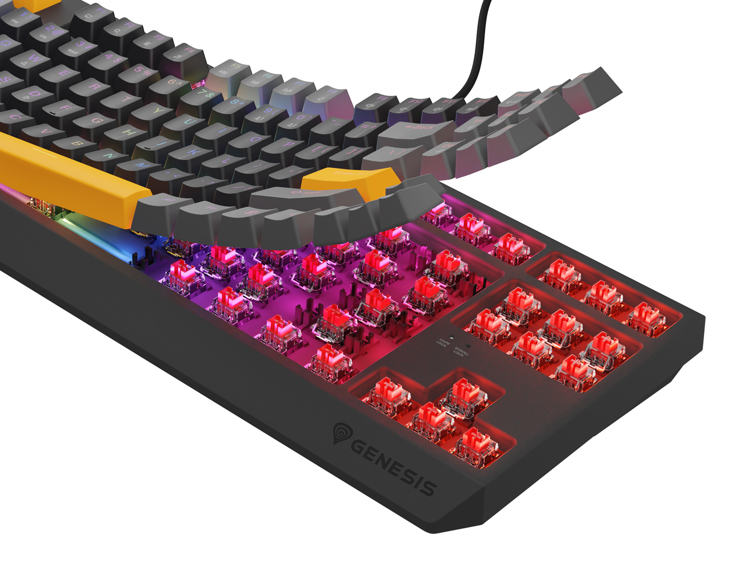 Klávesnici Genesis Thor 230 TKL jsme vybavili lineárními spínači Outemu Red, které vynikají vysokou přesností, aktivací bez ohledu na místo stisknutí klávesy a vysokou dynamikou. Víme však, že jako hráč můžete mít své vlastní preference. Proto jsme do Genesis Thor 230 TKL implementovali Hot Swap - techniku, která vám umožní nahradit jakýkoli třípinový mechanismus mikrospínačem od společností jako Outemu, Akko, KTT. Jednoduše vytáhněte nainstalovaný mechanismus a zapojte nový. Díky systému Hot Swap také nemusíte kupovat novou klávesnici, když jeden spínač selže. Vyměníte jej během několika sekund. Je to jednoduché.