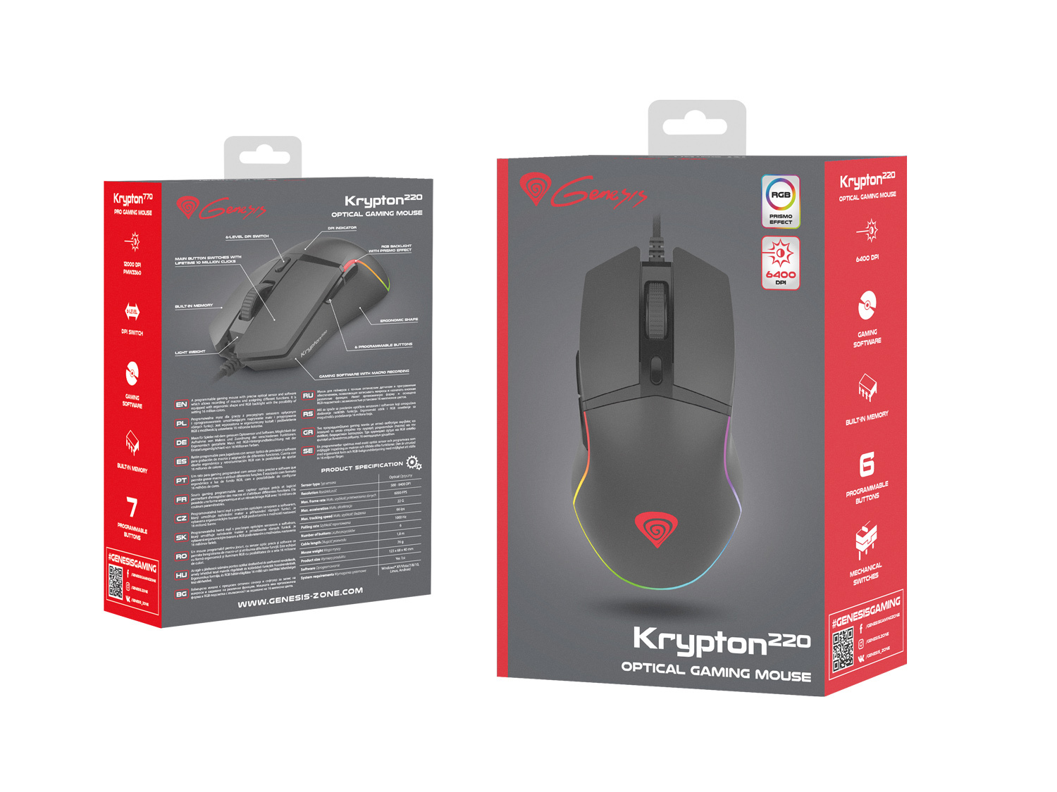 Genesis herní optická myš KRYPTON 220/RGB/6400 DPI/Herní/Optická/6 000 DPI/Drátová USB/Černá