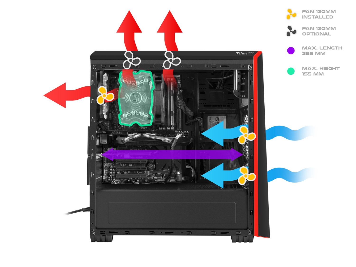 Genesis Titan 700 je prostorná a funkční počítačová skříň v moderním designu. Skříň poskytuje prostorný vnitřek, který směstná i ten nejvýkonnější hardware. Skříň je vybavená průhlednou bočnici a třemi 120mm ventilátory s červeným podsvícením.