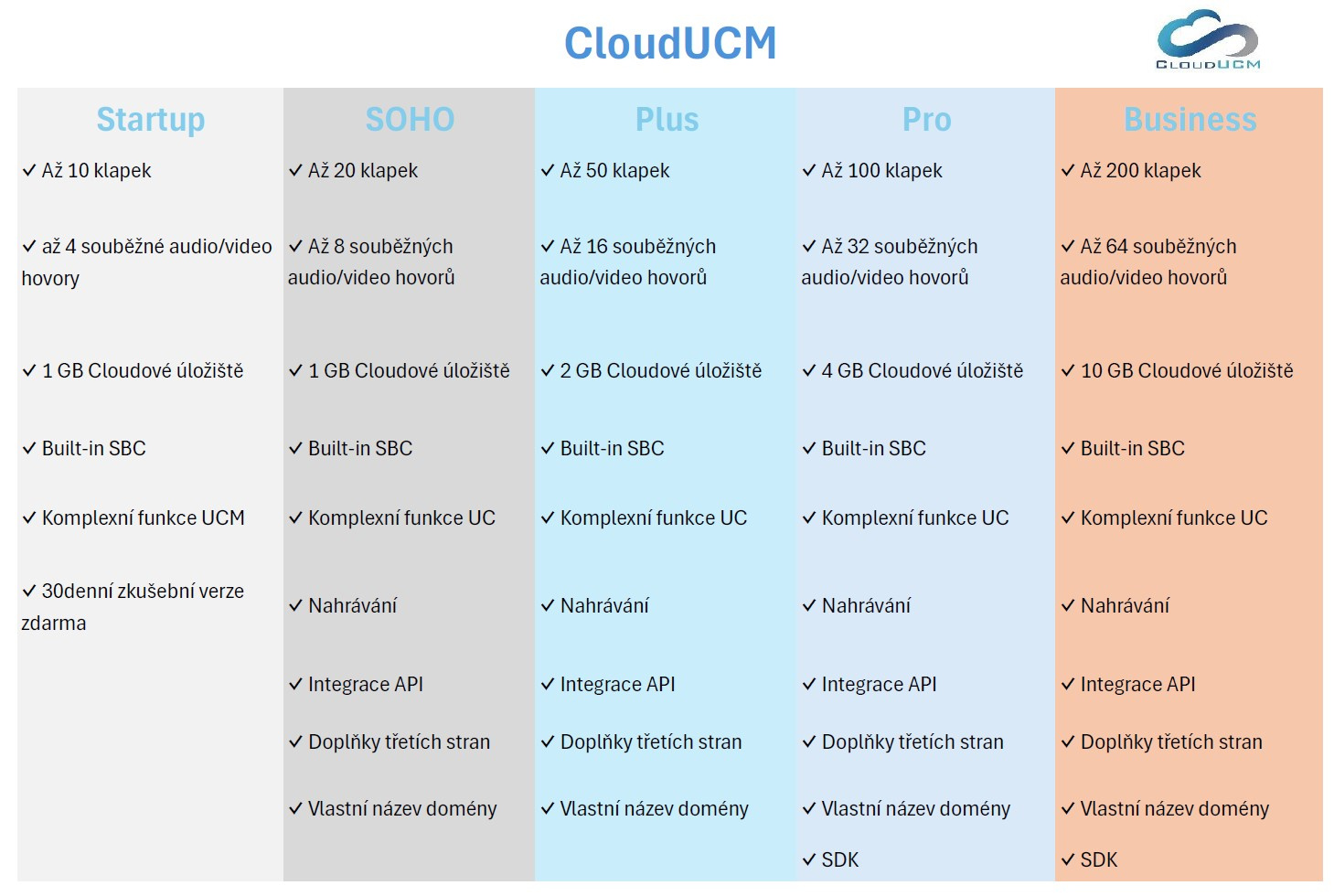 CloudUCM je cloudové řešení PBX, které poskytuje škálovatelnou a bezpečnou platformu pro obchodní komunikaci a spolupráci s výkonnými funkcemi a integracemi, které týmům umožňují být produktivnější než kdykoli předtím. Tato cloudová PBX sjednocuje veškerou obchodní komunikaci do jednoho centralizovaného řešení, které poskytuje hlasové a videohovory, schůzky, chat, data, analýzy, mobilitu, dohled, přístup k zařízení, interkomy a další.