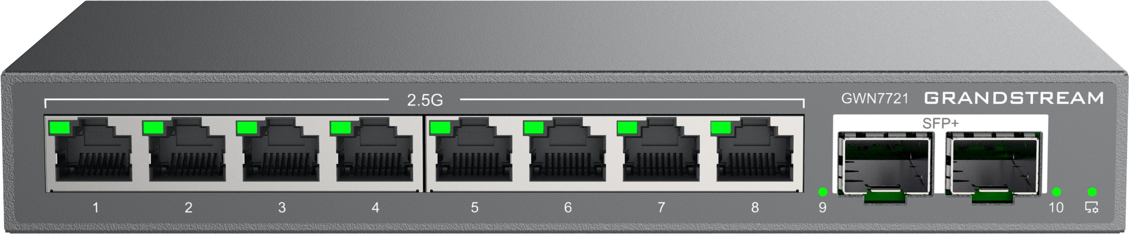GWN7721 je 10portový managovatelný switch L2 Lite, vybavený 8x 2,5G ethernetovými porty a 2x 10gigabitovými SFP+ porty, vhodný pro malé a střední podniky pro budování škálovatelných, bezpečných a inteligentních sítí.