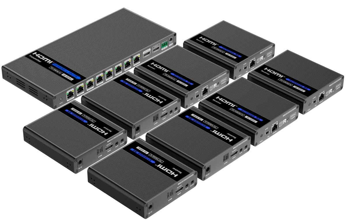 Extender se skládá z jedné vysílací jednotky s lokálním výstupem HDMI a osm přijímačů, které se propojí CAT6/6a/7 kabelem s vysílačem.