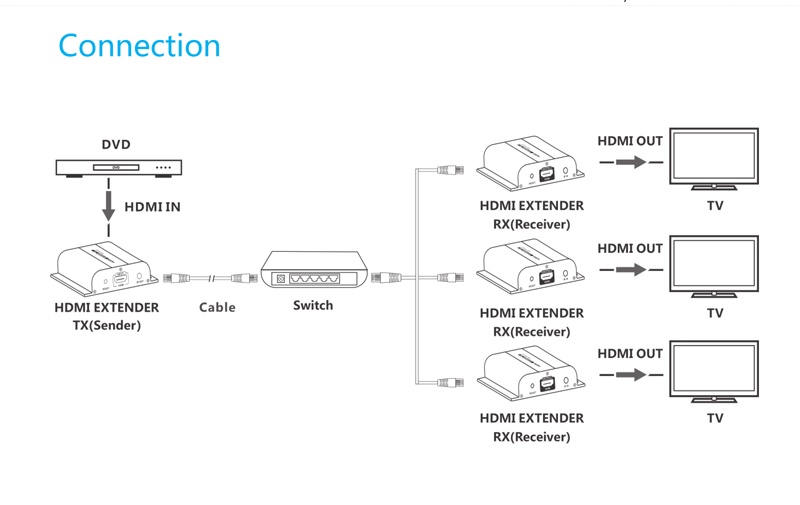 - Extender umožňuje použití jednoho vysílače a více přijímačů vzájemně propojených pomocí LAN sítě, switchů a routerů (otestováno na FULL HD 1080p a 100m kabelu + swich + 2 přijímače) tato počítačová síť musí být vyhrazena pouze pro HDMI extendery, nesmí sdílet další počítače, tiskárny a jiná síťová zařízení.