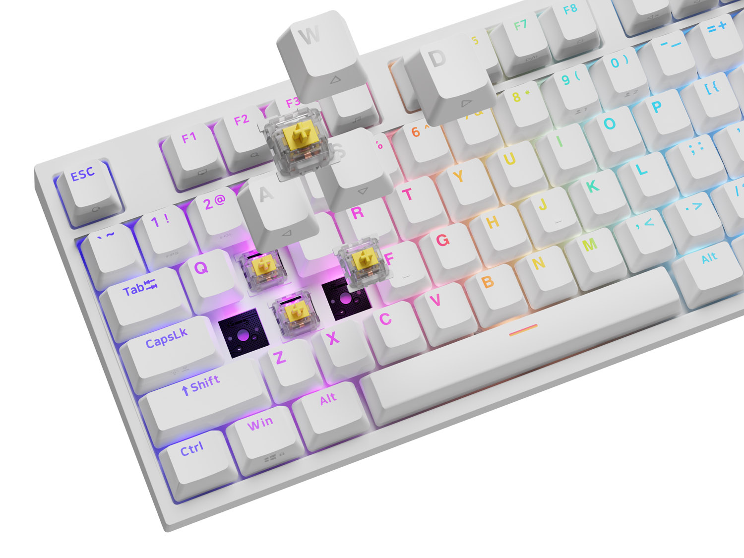 - 5kolíkové zásuvky Hotswap umožňují výměnu jakýchkoli spínačů bez použití nářadí.