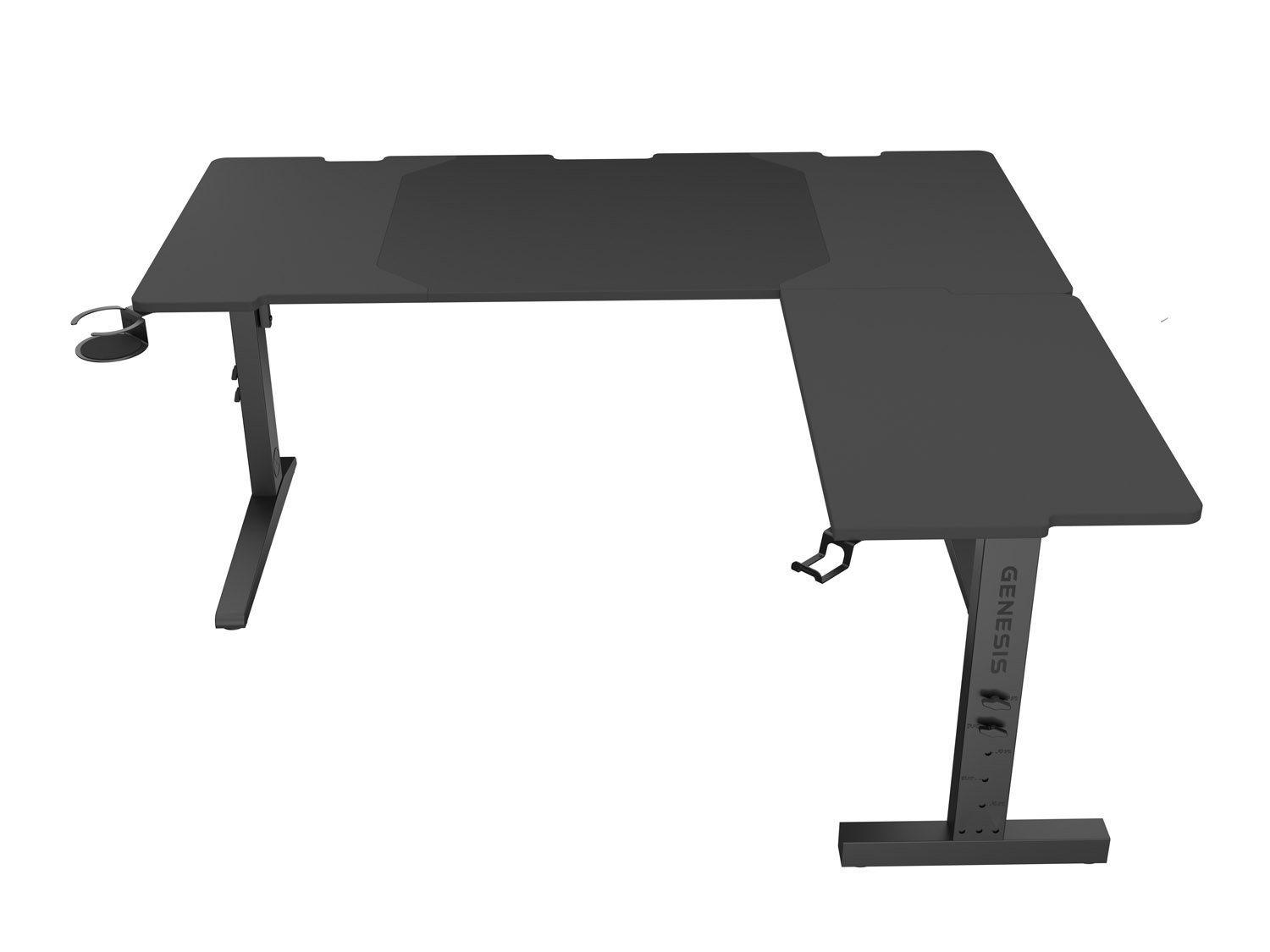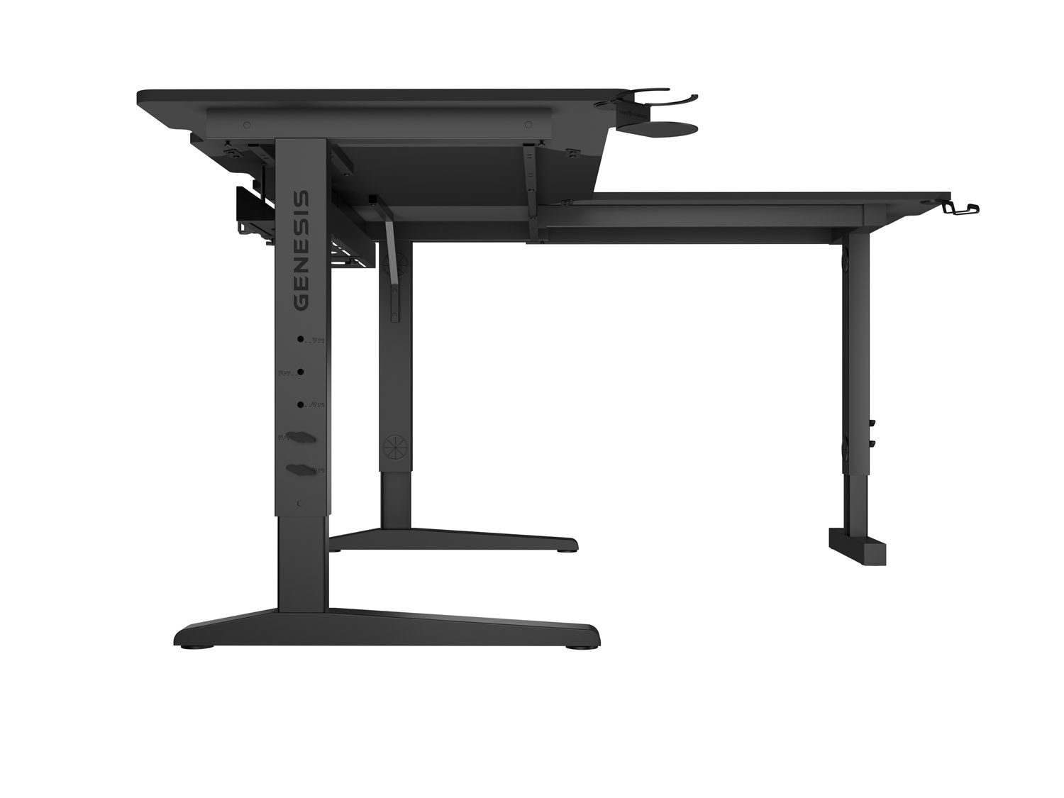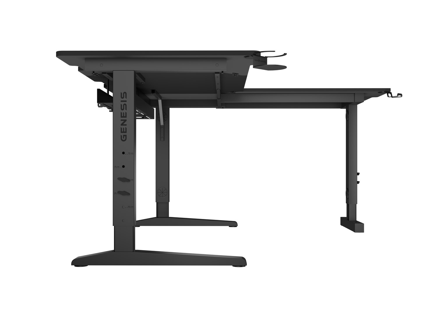 - Robustní výsuvný ocelový rám a vyměnitelné boční desky stolu usnadňují přizpůsobení hlavního stolu vašim preferencím (sada obsahuje dvě boční desky, další velikosti jsou k dispozici nawww.genesis-zone.com).