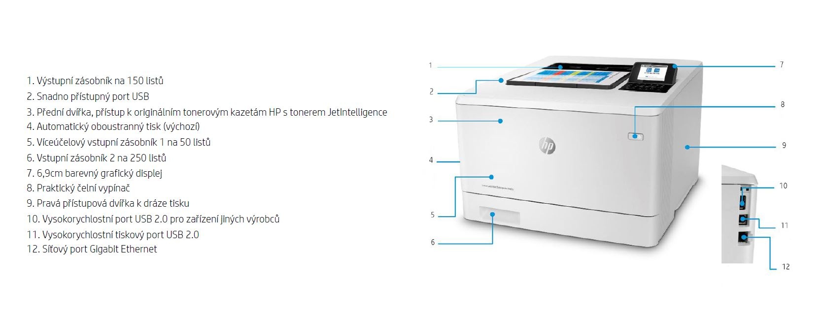 Obsah balení: Tiskárna HP Color LaserJet Enterprise M455dn; Černá originální tonerová kazeta HP LaserJet (cca 2 400 stran); Azurová, purpurová, žlutá originální tonerová kazeta HP LaserJet (každá kazeta cca 2 100 stran); Úvodní příručka; 1x napájecí kabel