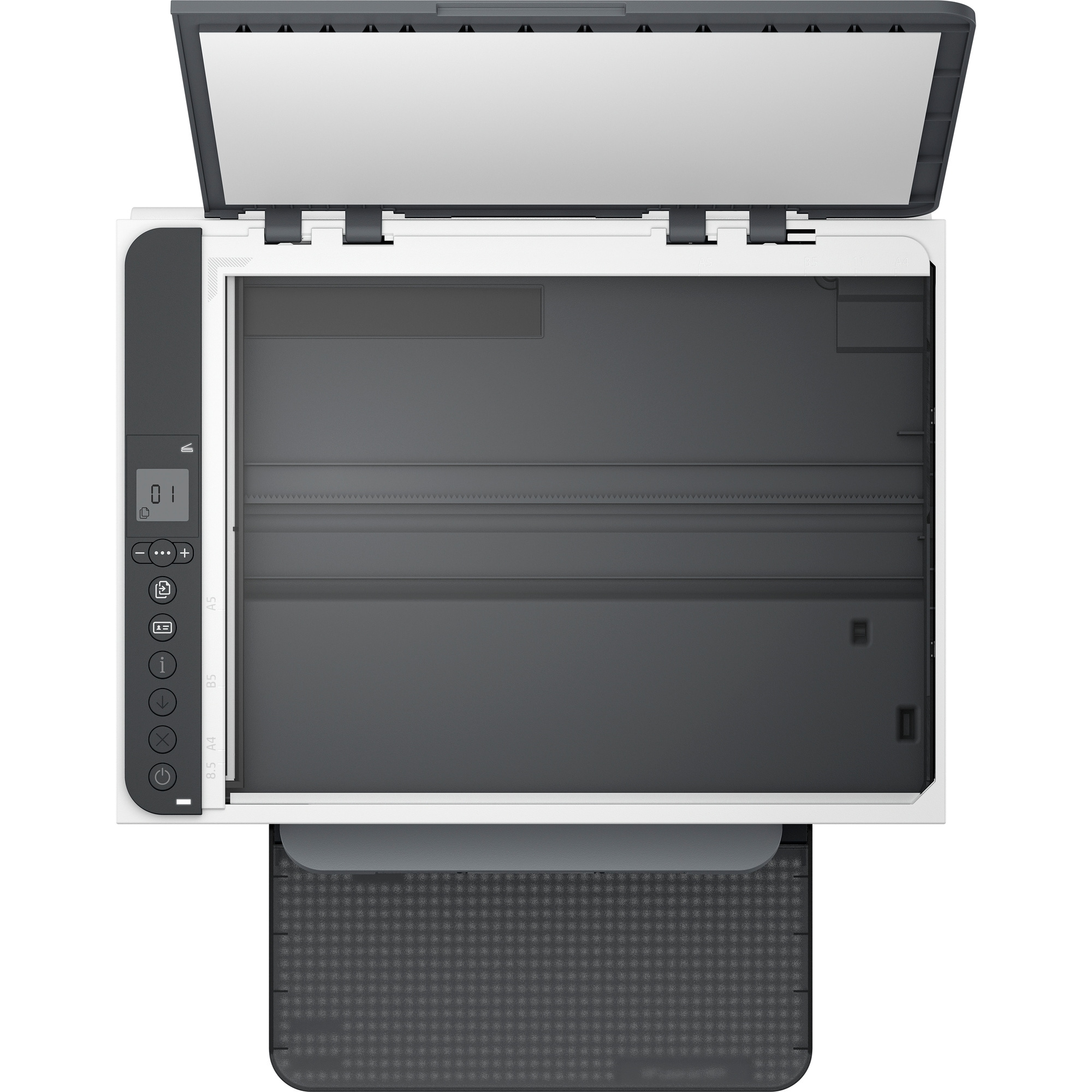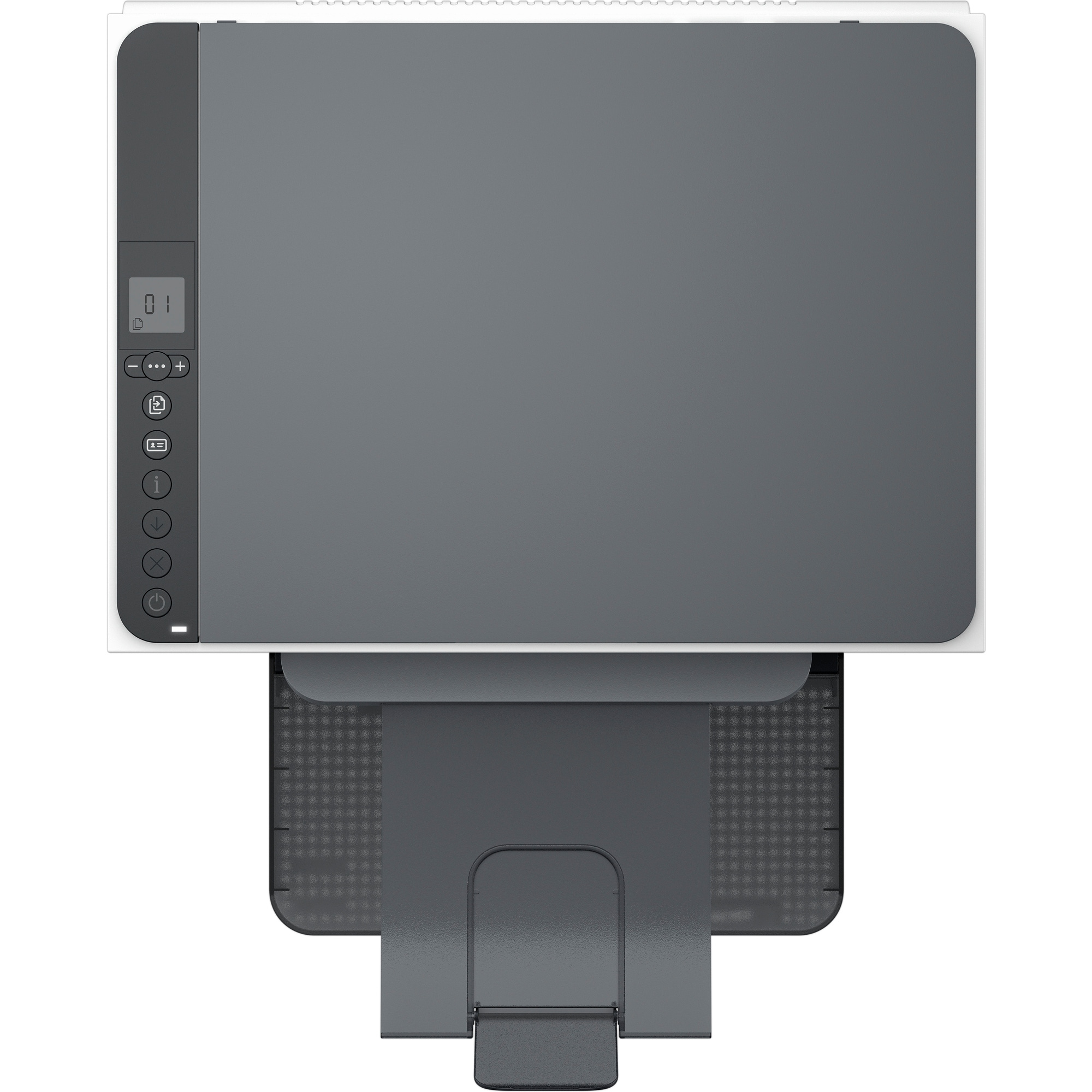 *Displej LCD s ikonami; 3 kontrolky (média, toner, otevřený kryt); 10 tlačítek (Wi-Fi, minus, nabídka, plus, kopírování, kopírování dokladů, informace, pokračování, zrušení, napájení)