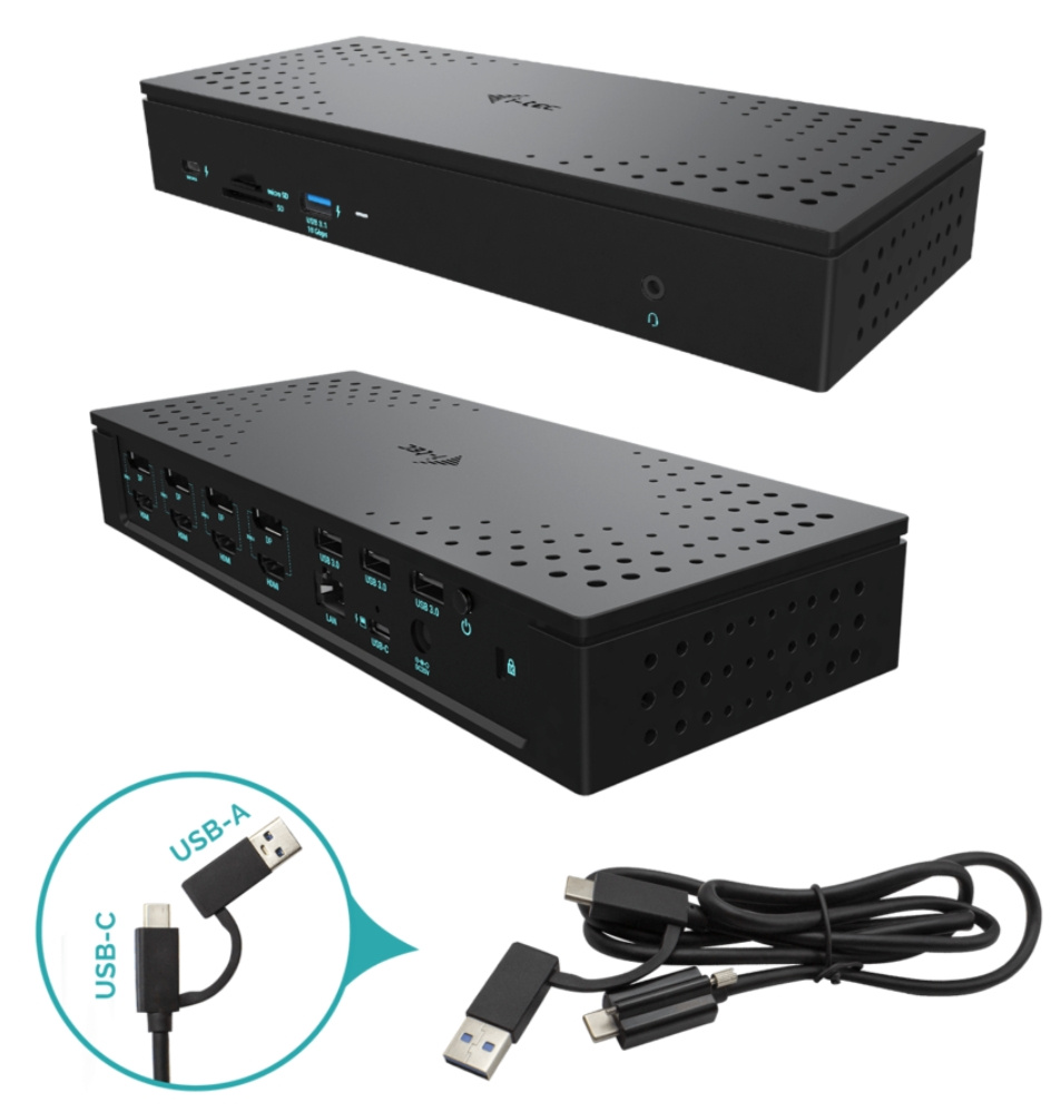 Dokovací stanice s maximálním možným výkonem. Podpora až čtyř externích monitorů v rozlišení 4K / 60 Hz, případně 2x 5K / 60 Hz. Perfektní produkt pro uživatele, kteří vyžadují více monitorů, bez kompromisů v oblasti stability obrazu, rozlišení a obnovovací frekvence. Dokovací stanice je rovněž vybavena rychlonabíjecím portem USB-C (s nabíjecím výkonem až 30W), zejména pro nabíjení chytrých telefonů a tabletů, rychlými USB porty, 2.5 Gbps LAN portem, a rovněž tak i dalšími periferiemi.