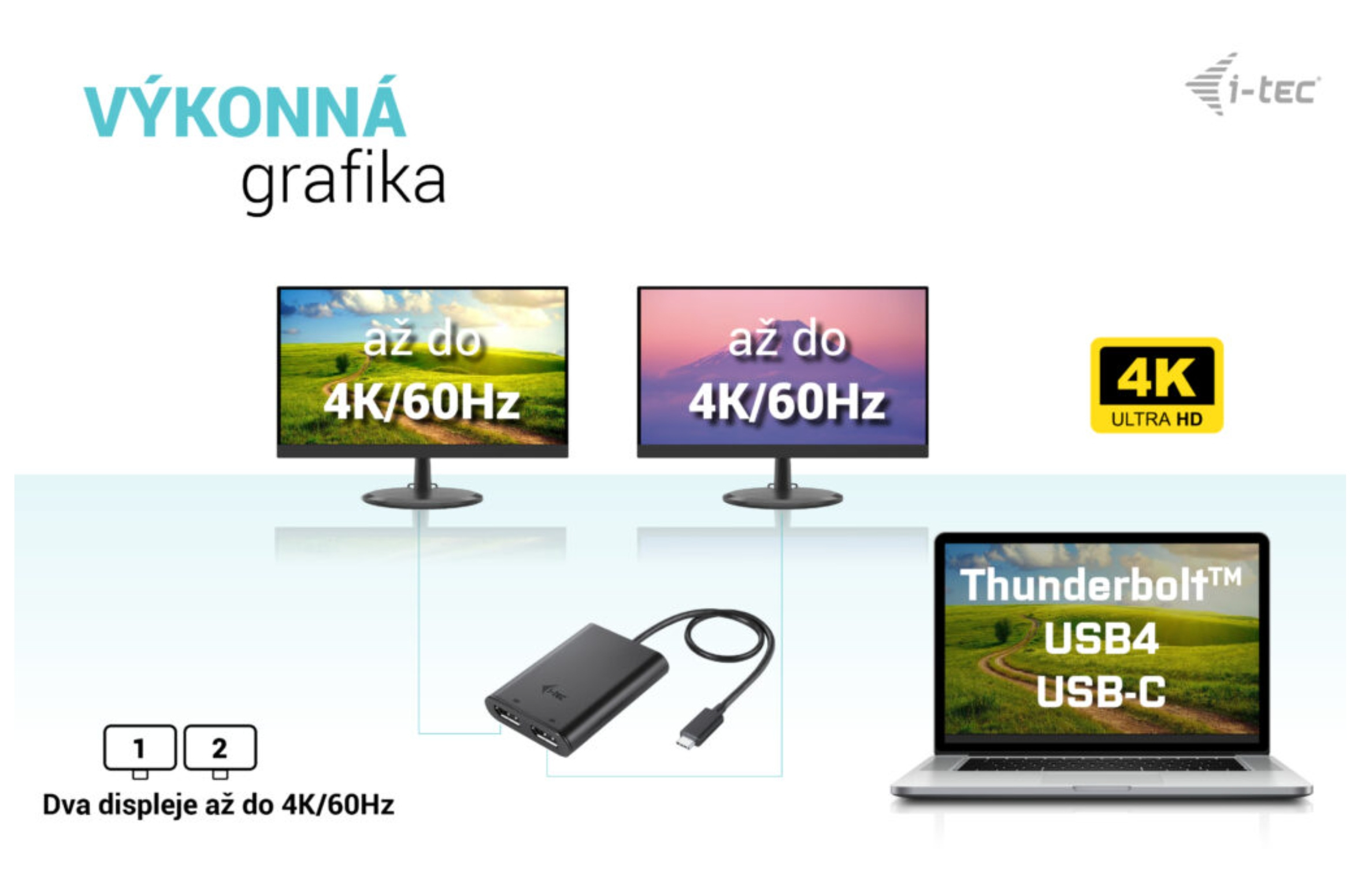 • Výkonný videoadaptér USB-C, ke kterému lze připojit až dva monitory současně