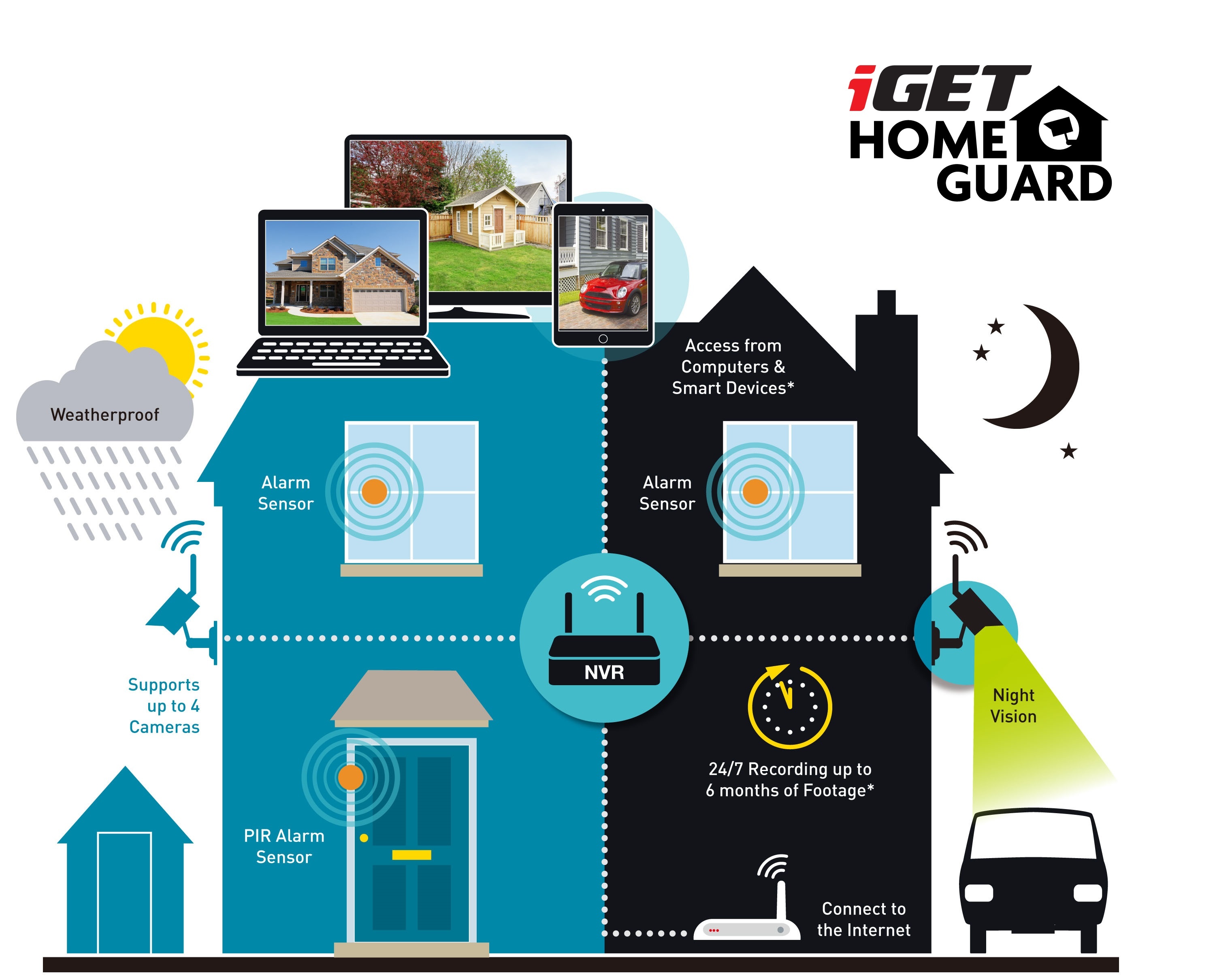 Barevná venkovní odolná WiFi FullHD kamera iGET HOMEGUARD HGNVK929CAM s IP66 krytím je příslušenství k kamerovému setu iGET HOMEGUARD HGNVK88304. Také je určena pro další sety iGET HOMEGUARD HGNVKx83xx. Rozlišení FullHD 1080p (1920 x 1080) pro video ve velmi vysoké kvalitě, denní i noční provoz, snímač 1/2.7" CMOS, IR přisvětlení až 30 m, ohnisková vzdálenost 3,6 mm, odolnost proti prachu a vodě IP66. Úhel záběru 90°. Připojení pomocí WiFi nebo LAN RJ45.