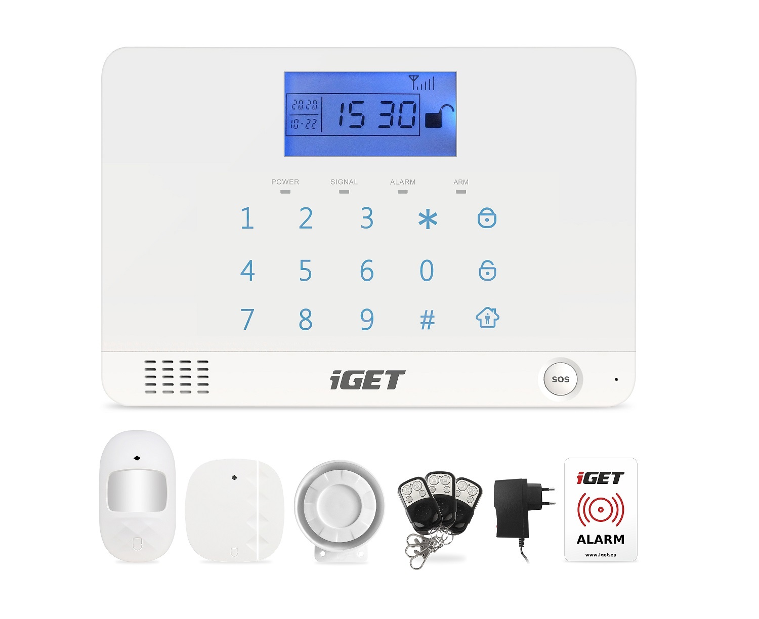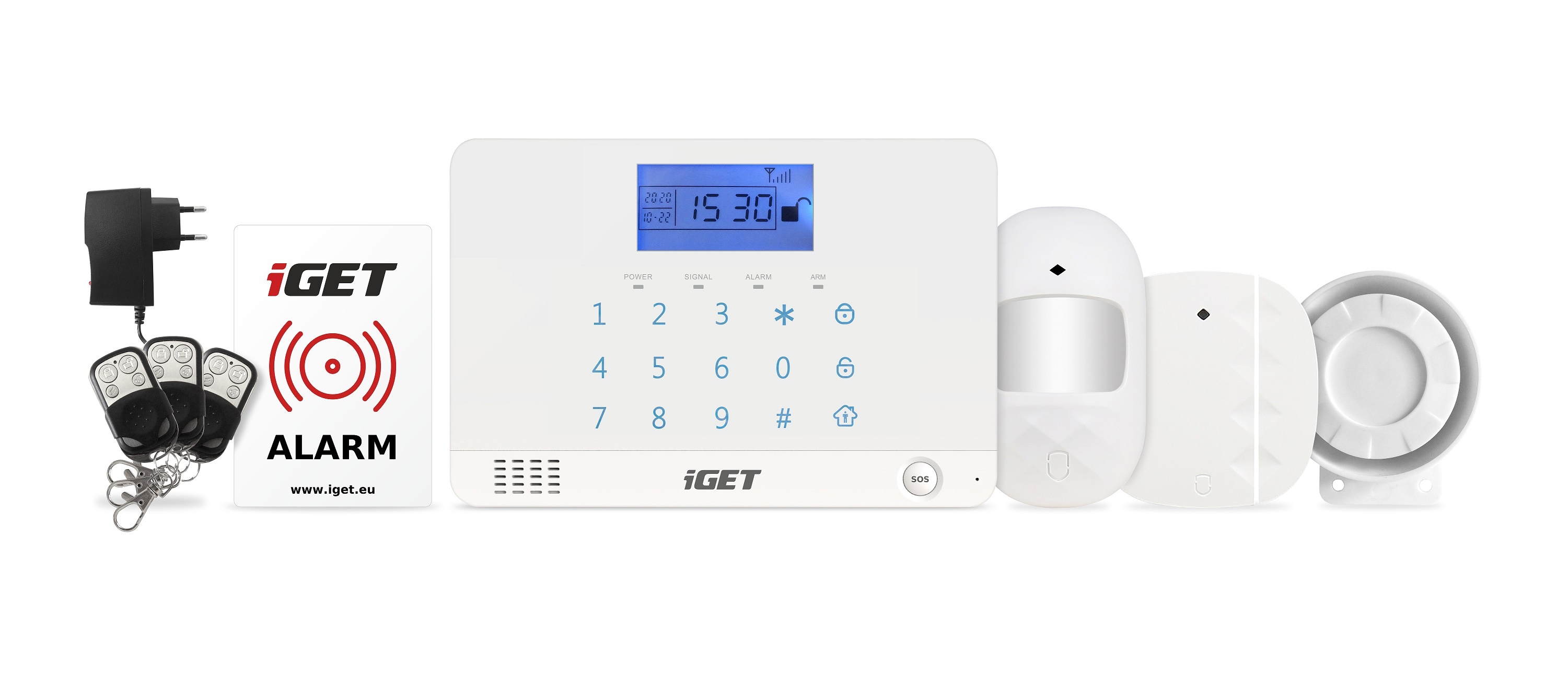 Víceúčelový bezdrátový GSM alarm iGET SECURITY M3B. V setu detektor na dveře a okna, detektor pohybu, siréna 110 dB, 3x klíčenky, 2x varovné nálepky, napájecí adaptér, manuál CZ/SK/HU. Aplikace v češtině a angličtině. Alarm při poplachu telefonuje nebo odesílá SMS. Aplikace v češtině pro Android a iOS.