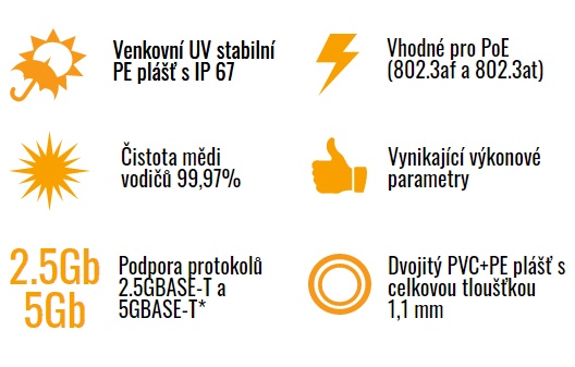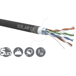 Instalační kabel Solarix s označením SXKD-5E-FTP-PVC+PE je spolehlivý stíněný kabel kategorie 5E s dvojitým pláštěm, který je určený pro provoz ethernetových protokolů, včetně 2.5GBASE-T a 5GBASE-T*. Konstrukce kabelu je F/UTP, typ pláště je PVC (vnitřní plášť) a UV stabilní PE (vnější plášť) s třídou reakce na oheň Fca. Vodiče kabelu jsou vyrobeny z kvalitního měděného drátu s čistotou mědi 99,97 %. Kabel bez problémů splňuje požadavky z mezinárodních standardů ISO/IEC 11801, EN 50173 a ANSI/TIA 568.2-D. Kabel je určen pro náročnější instalace, kde dvojitý PVC+PE plášť s celkovou tloušťkou 1,1 mm, poskytuje vysokou ochranu proti vlivům okolního prostředí. Stejně jako ostatní kabely Solarix, je i kabel SXKD-5E-FTP-PVC+PE značen metráží po 1 m v rozsahu od 0 do 305 m. Kabel je dodáván na vysoce pevné dřevěné cívce, na které jsou uvedeny všechny nezbytné produktové informace, včetně čárových kódů, výrobní šarže, popisu a nejdůležitějších technických parametrů. Tento kabel není určen pro trvalé uložení do vody ani do země bez odpovídající řádné ochrany.