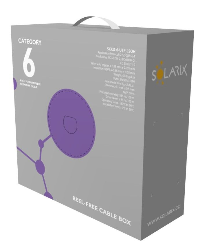 POZOR, nový 100 m box. Instalační kabel Solarix s označením SXKD-6-UTP-LSOH je spolehlivý nestíněný kabel kategorie 6, který je testován až do šířky pásma 450 MHz, a je určený pro provoz ethernetových protokolů, včetně 2.5GBASE-T a 5GBASE-T. Konstrukce kabelu je U/UTP s plastovým křížem, který zajišťuje maximální oddělení párů od sebe po celé délce kabelu. Typ pláště je LSOH s třídou reakce na oheň Dca-s2,d2,a1. Vodiče kabelu jsou vyrobeny z kvalitního měděného drátu s čistotou mědi 99,97 %. Kabel bez problémů splňuje požadavky z mezinárodních standardů ISO/IEC 11801, EN 50173 a ANSI/TIA 568.2-D. Výkonové parametry tohoto kabelu byly otestovány nezávislou testovací zkušebnou FORCE TECHNOLOGY v rámci programu EC Verified, a to na nejvyšší úroveň tzv. Component Level. Certifikát je k dispozici zde na webu v záložce "Odkazy" nebo přímo na stránkách laboratoře FORCE. V případě CPR (nařízení EU č. 305/2011) je kabel testován v systému posuzování vlastností AVCP 3. Stejně jako ostatní kabely Solarix, je i kabel SXKD-6-UTP-LSOH značen metráží po 1 m v rozsahu od 0 do 100 m. Kabel je dodáván ve vysoce odolném třívrstvém leštěném kartónovém boxu, na kterém jsou uvedeny všechny nezbytné produktové informace, včetně čárových kódů, výrobní šarže, popisu a nejdůležitějších technických parametrů.