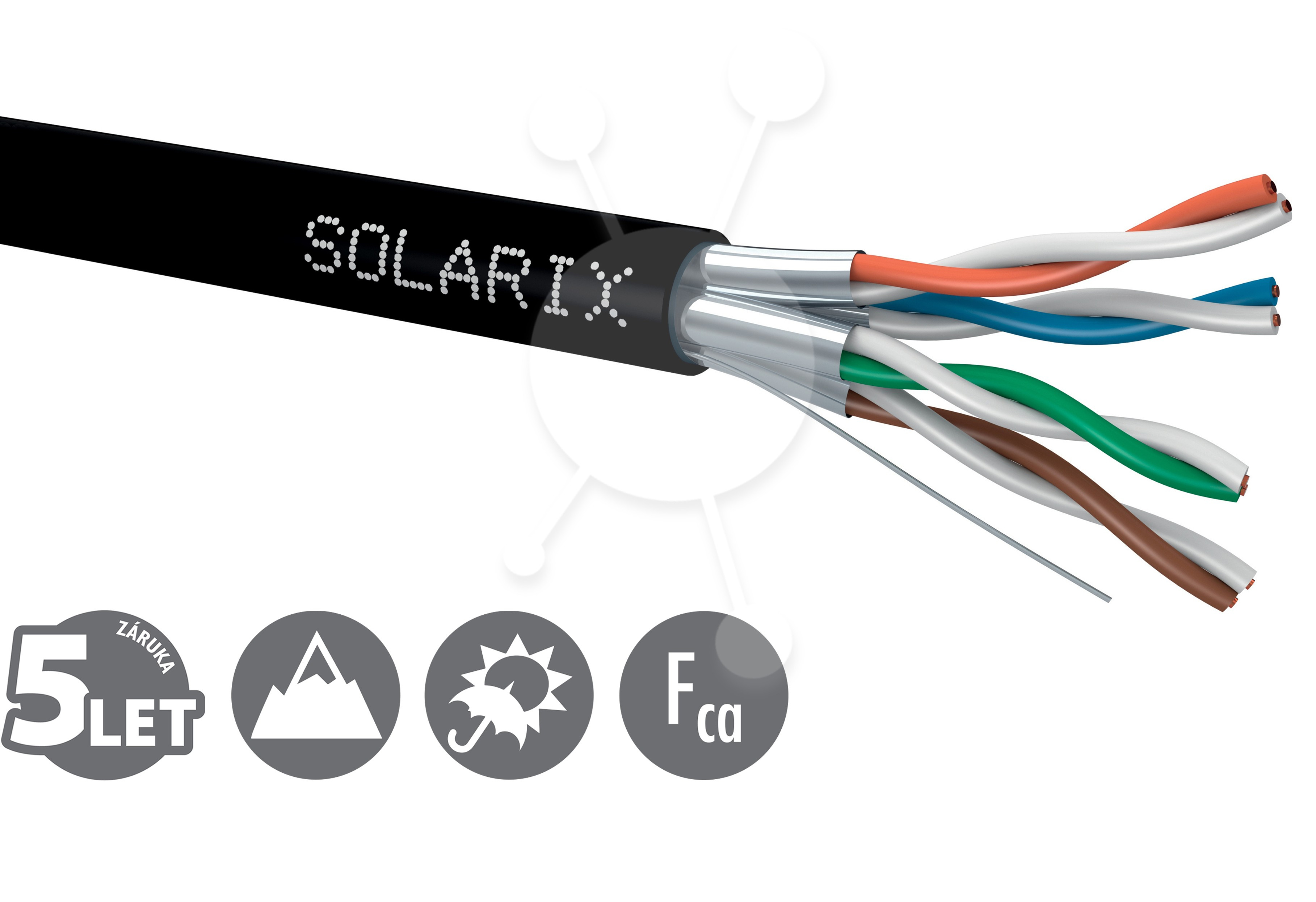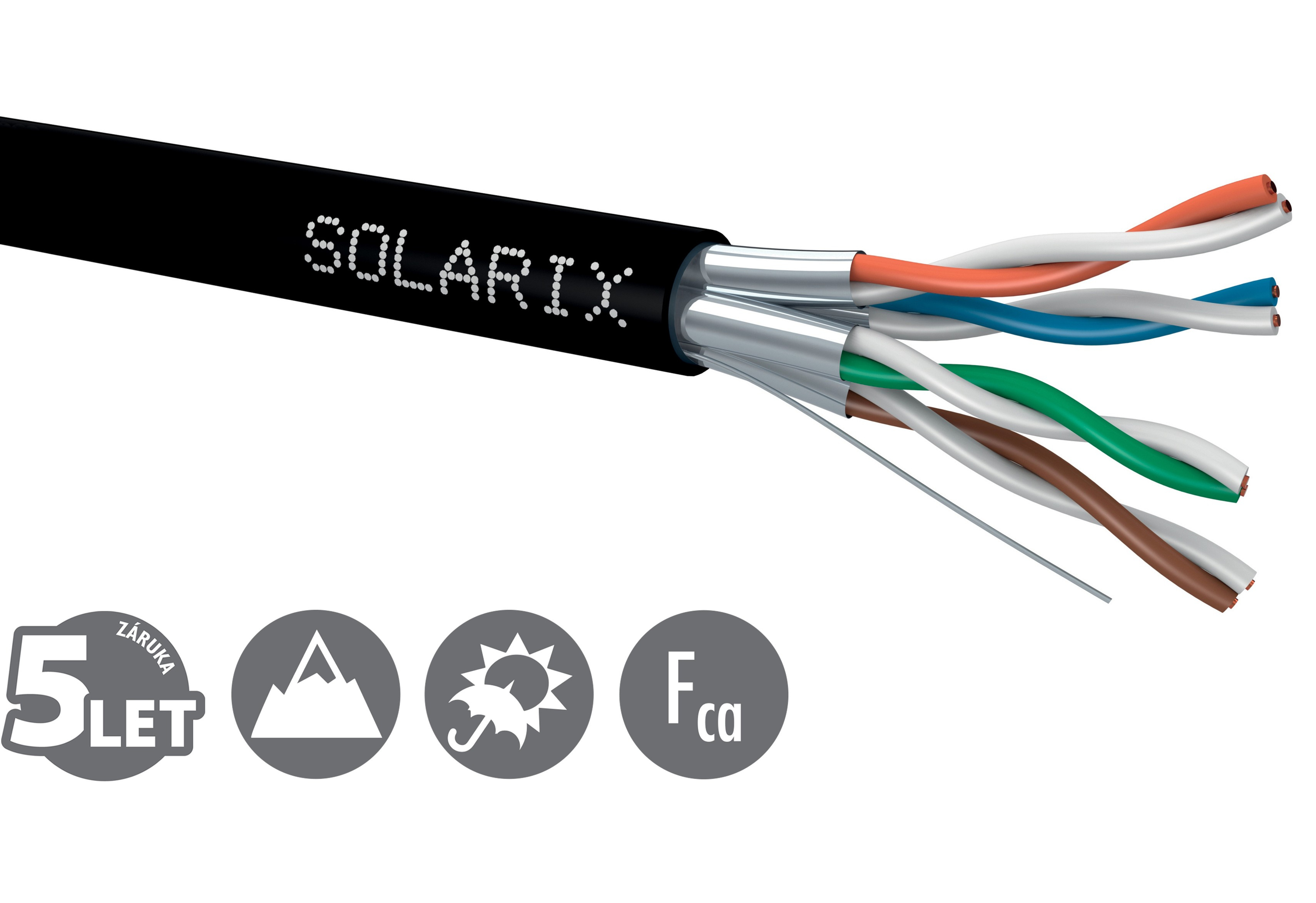 Instalační kabel Solarix s označením SXKD-6A-STP-PE je jvysoce kvalitní stíněný kabel kategorie 6A, který je určený pro provoz vysokorychlostních ethernetových protokolů, včetně 10GBASE-T. Konstrukce kabelu je U/FTP, typ pláště UV stabilní PE s třídou reakce na oheň Fca a stupněm krytí IP67. Vodiče kabelu jsou vyrobeny z kvalitního měděného drátu s čistotou mědi 99,97 %. Kabel bez problémů splňuje požadavky z mezinárodních standardů ISO/IEC 11801, EN 50173 a ANSI/TIA 568.2-D. Stejně jako ostatní kabely Solarix, je i kabel SXKD-6A-STP-PE značen metráží po 1 m v rozsahu od 0 do 500 m. Kabel je dodáván na vysoce pevné dřevěné cívce, na které jsou uvedeny všechny nezbytné produktové informace, včetně čárových kódů, výrobní šarže, popisu a nejdůležitějších technických parametrů. Tento kabel není určen pro trvalé uložení do vody ani do země bez odpovídající řádné ochrany.