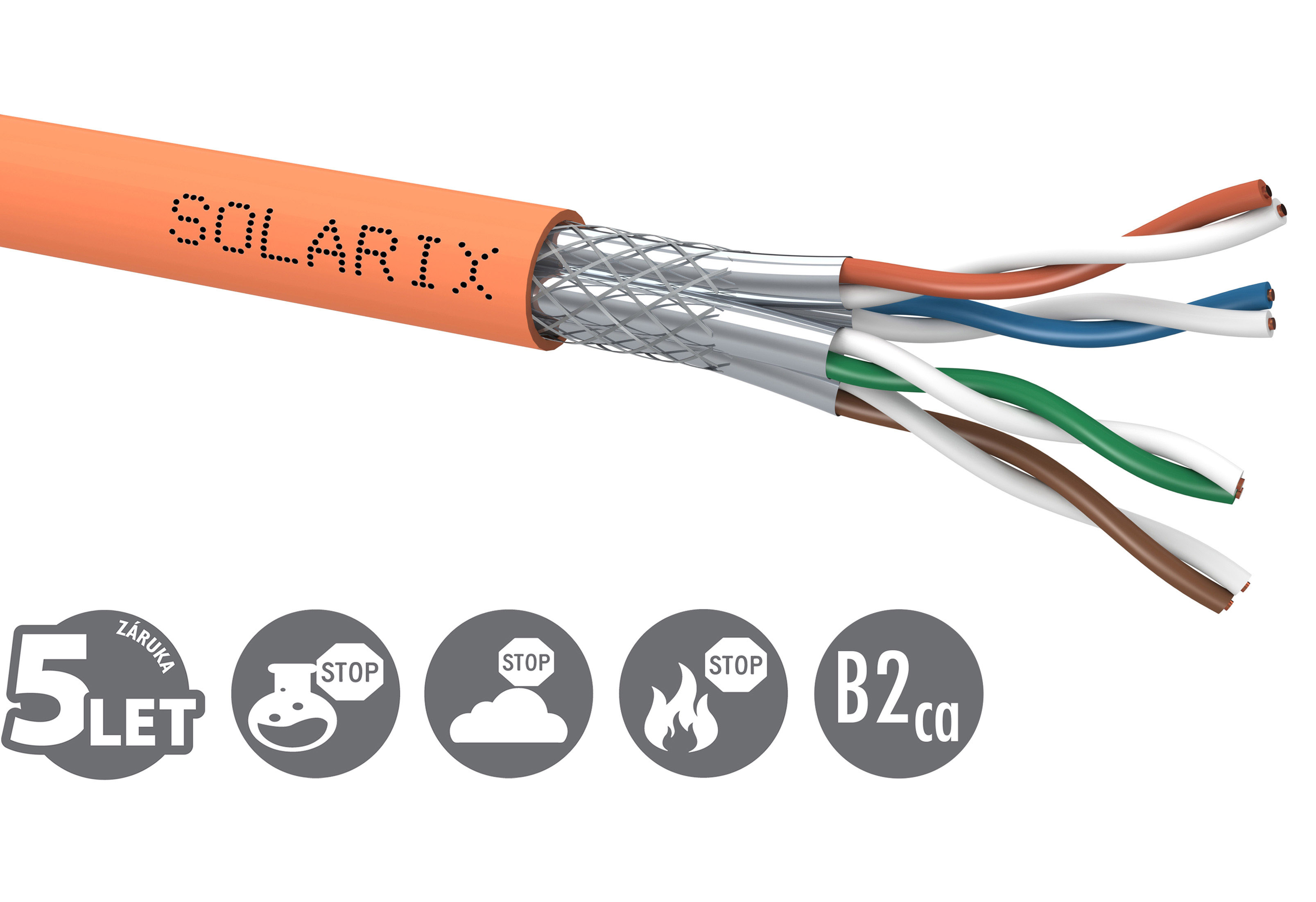Instalační kabel Solarix s označením SXKD-7A-1200-SSTP-LSOHFR-B2ca je vysoce kvalitní dvakrát stíněný kabel kategorie 7A, který je testovaný až do šířky pásma 1 200 MHz a je určený pro provoz vysokorychlostních ethernetových protokolů, včetně 10GBASE-T. Konstrukce kabelu je S/FTP, typ pláště LSOHFR s třídou reakce na oheň B2ca-s1,d1,a1. Vodiče kabelu jsou vyrobeny z kvalitního měděného drátu s čistotou mědi 99,97 %. Kabel bez problémů splňuje požadavky z mezinárodních standardů ISO/IEC 11801 a EN 50173. Výkonové parametry tohoto kabelu byly otestovány nezávislou testovací zkušebnou FORCE TECHNOLOGY v rámci programu EC Verified, a to na nejvyšší úroveň tzv. Component Level. Certifikát je k dispozici zde na webu v záložce "Odkazy" nebo přímo na stránkách laboratoře FORCE. V případě CPR (nařízení EU č. 305/2011) je kabel testován u nezávislé laboratoře FORCE CERTIFICATION v systému posuzování vlastností AVCP 1+ a rovněž splňuje vyhlášku MV ČR č. 23/2008 resp. vyhlášku č. 268/2011 o technických podmínkách požární ochrany staveb a je vhodný pro způsoby použití odpovídající kabelu s touto třídou reakce na oheň, které jsou definovány v Příloze č. 2 těchto vyhlášek. Stejně jako ostatní kabely Solarix, je i kabel SXKD-7A-1200-SSTP-LSOHFR-B2ca značen metráží po 1 m v rozsahu od 0 do 500 m. Kabel je dodáván na vysoce pevné dřevěné cívce, na které jsou uvedeny všechny nezbytné produktové informace, včetně čárových kódů, výrobní šarže, popisu a nejdůležitějších technických parametrů.