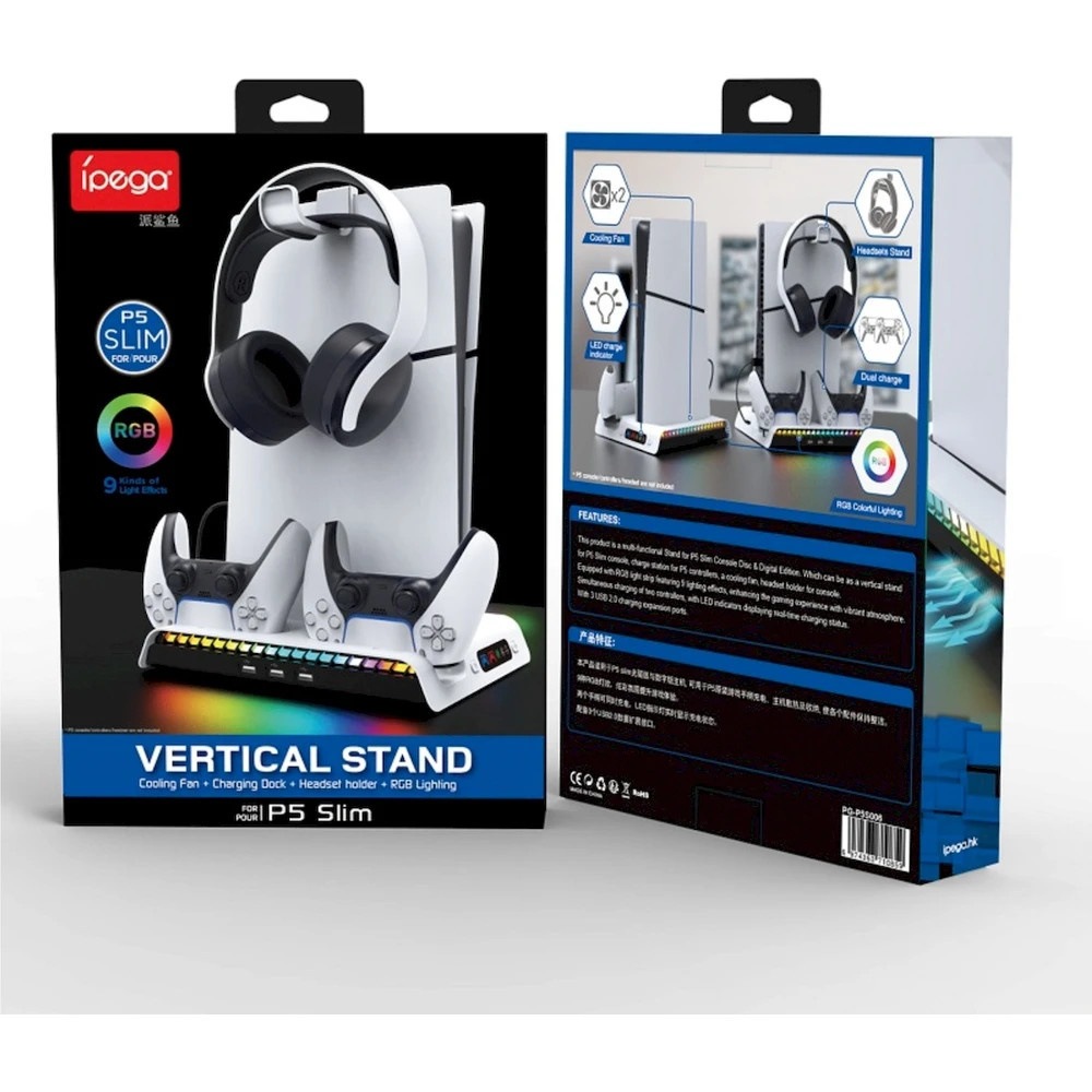 Nabíjecí stanice iPega pro Playstation 5 Slim (CD/Digital) s RGB podsvícením, aktivním chladícím systémem, držákem pro sluchátka a trojicí USB-A portů. Dokáže nabíjet dva DualSense ovladače a díky barevným ikonkám zobrazuje jejich aktuální stav baterie.