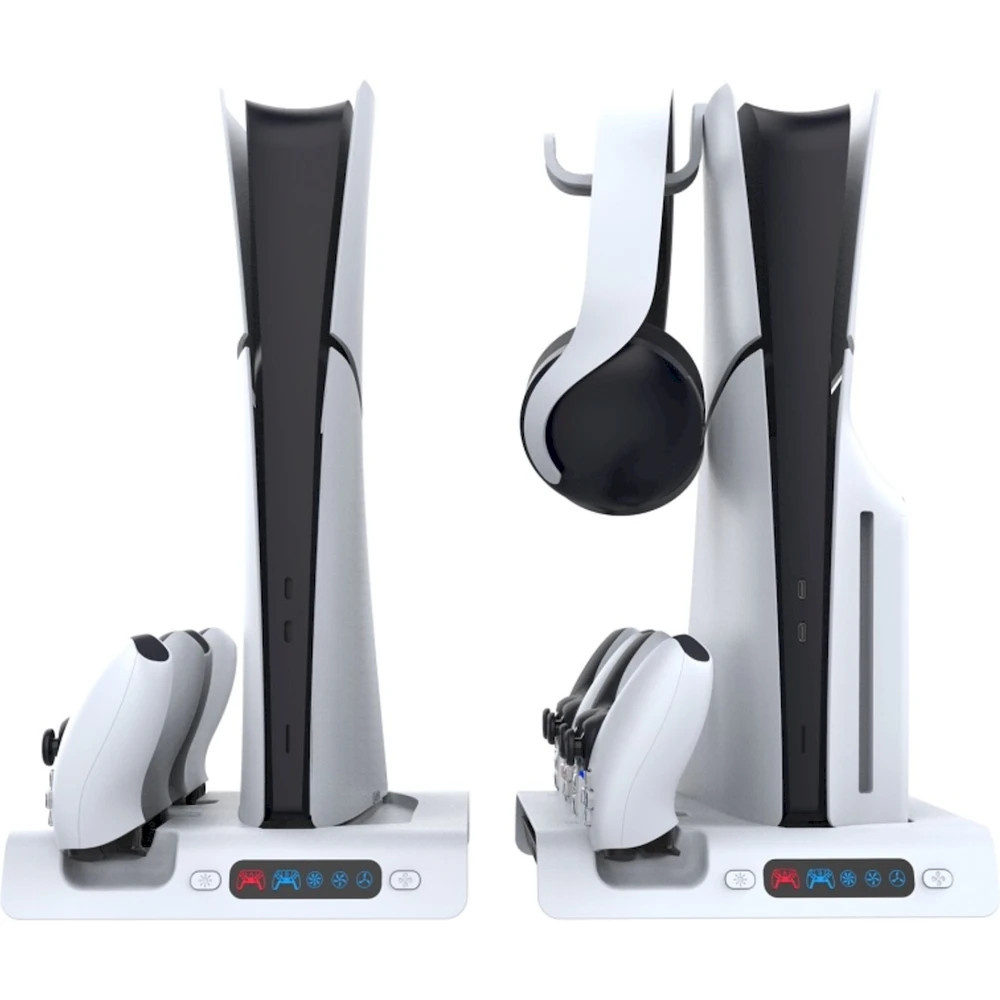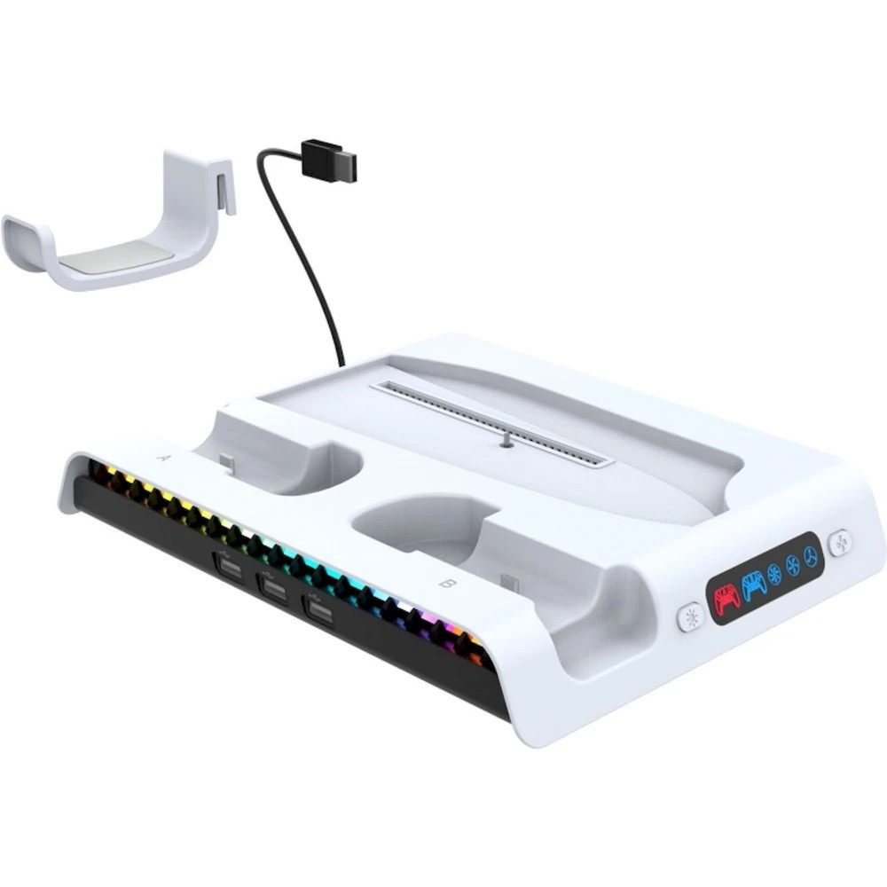 Nabíjecí stanice pro PlayStation 5 Slim s aktivním chlazením, RGB podsvícením, držákem na sluchátka, USB porty a nabíjecími kolébkami pro dva ovladače DualSense. Díky minimalistickému designu, ladící s herní konzolí, doplní váš herní koutek a zajistí vám stálé místo pro odkládání herních ovladačů. Stanice je vybavena stylovým RGB podsvícením, ve kterém se kombinuje 9 barevných odstínů. Podsvícení lze samozřejmě vypnout pomocí tlačítka na dokovací stanici.