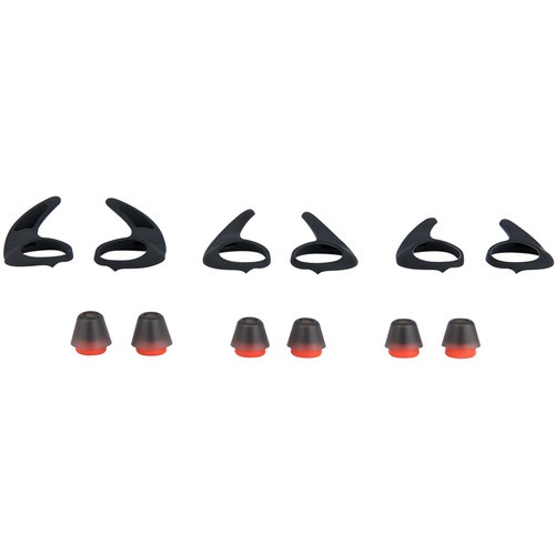 Sada příslušenství Jabra Evolve 75e obsahuje tři páry náhradních ušních špuntů (malá, střední, velká) a tři páry náhradních ušních křídel (malé, střední a velké) pro bezdrátové sluchátka Evolve 75e.