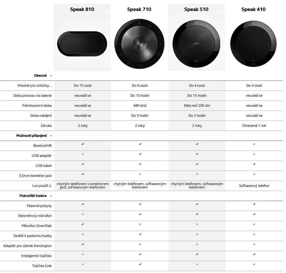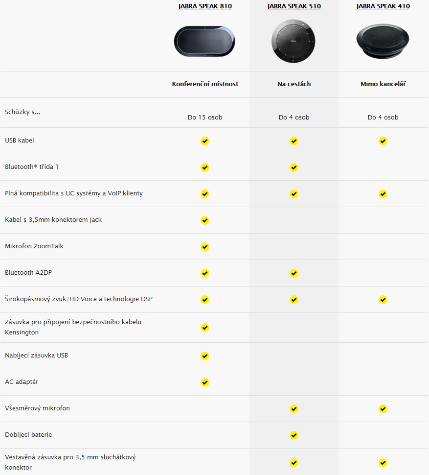 - Jabra SPEAK 510: stejné funkce jako 410, navíc obsahuje Bluetooth pro propojení k tabletu/smartphone