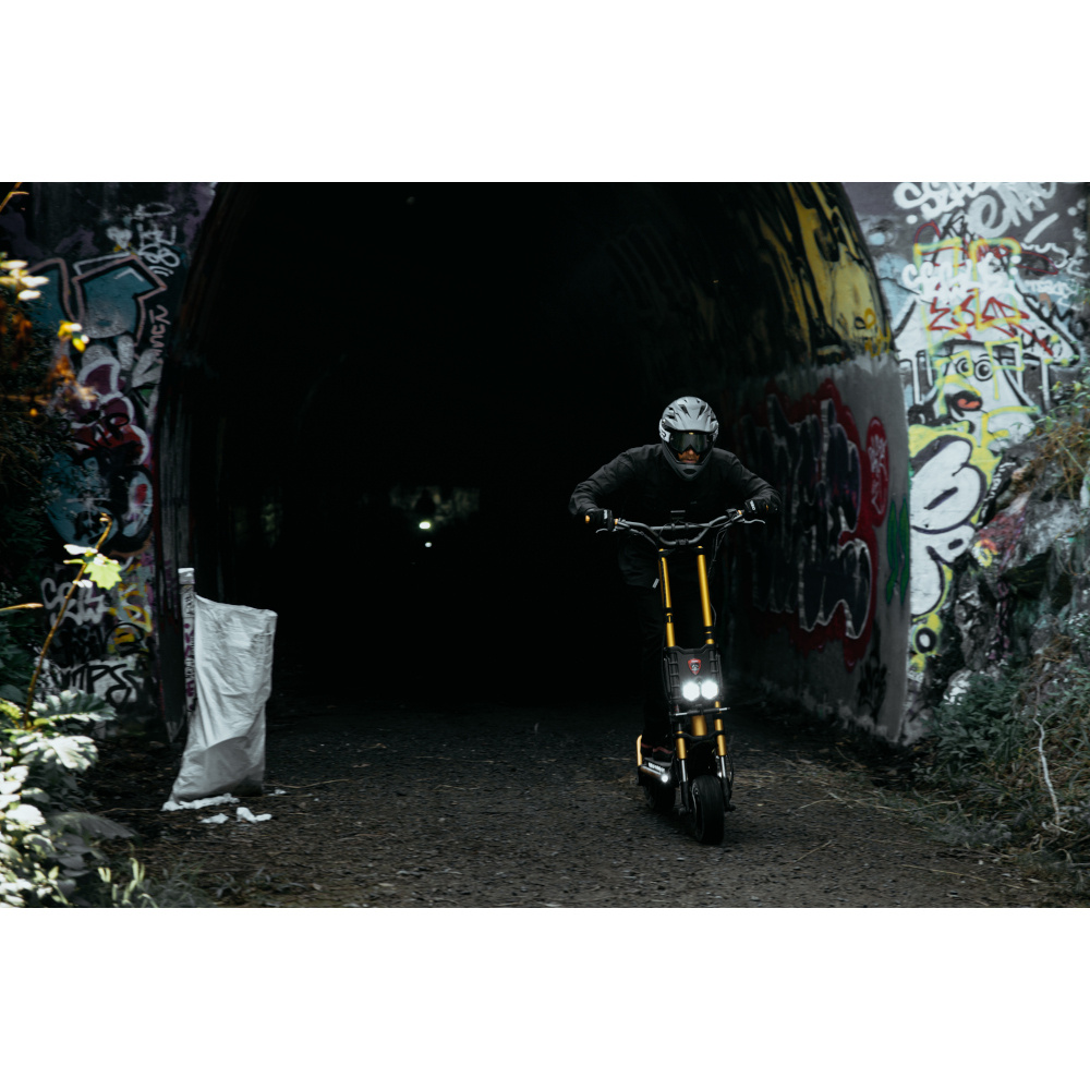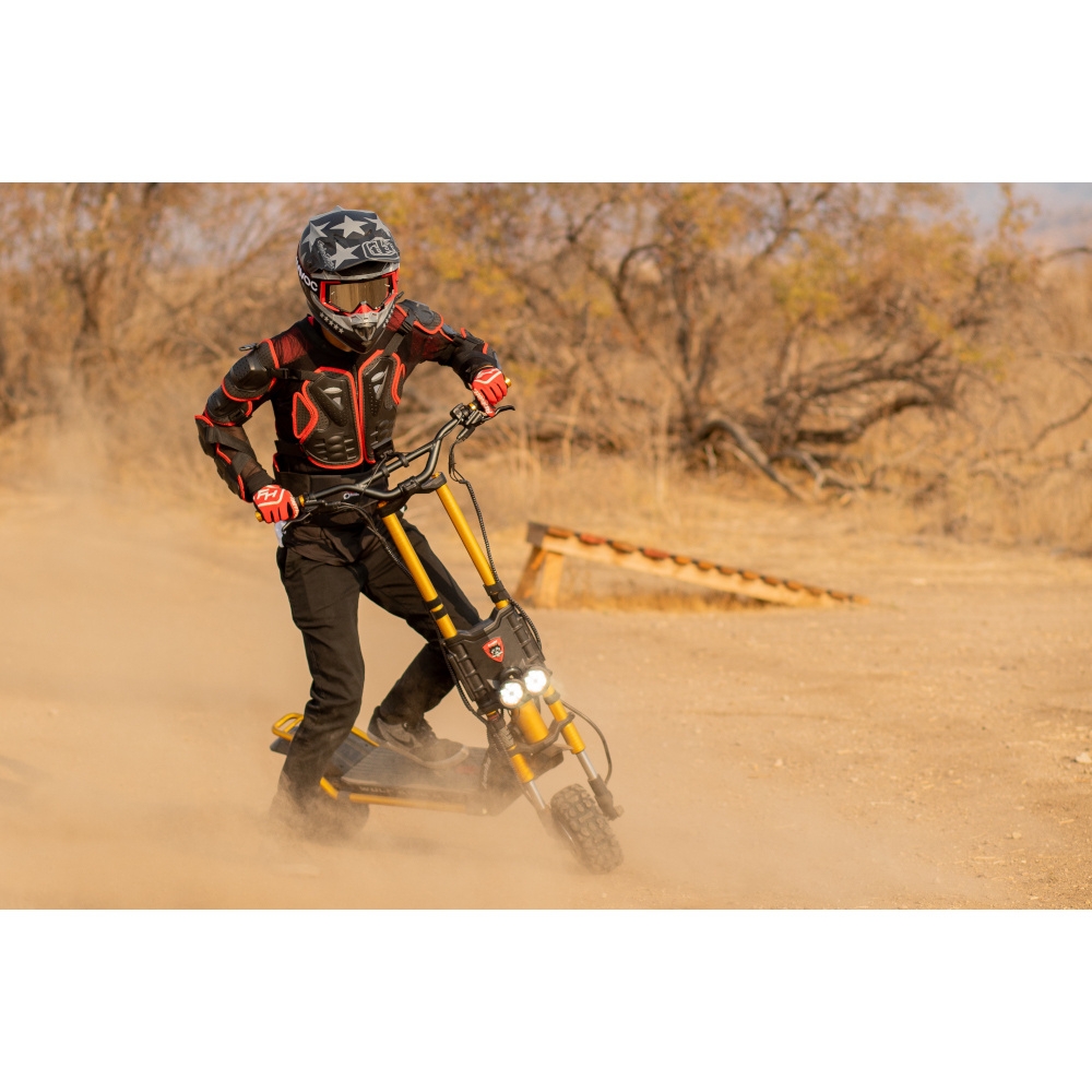 Nabídne Vám neopakovatelný zážitek na silnici i v terénu. Široká 11" offroadová kola v kombinaci s hydraulickým odpružením umožňují jet téměř jakýmkoliv terénem. Dva 2000W motory se nezaleknou ani až 50° stoupání.