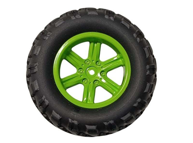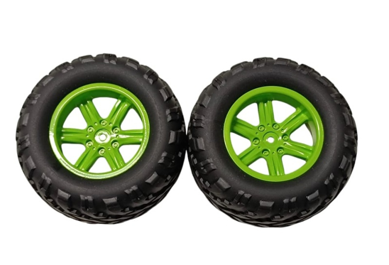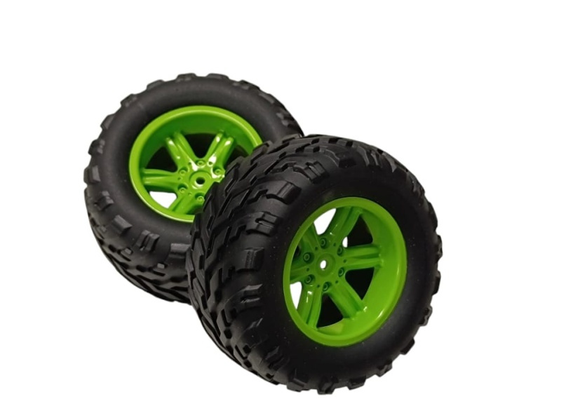 Kola pro model Dominátor Monster od RMT ( 2 ks) zelená Balení obsahuje : 2 ks kol- jedno levé a jedno pravé kolo Výška kola včetně pneu 10,3 cm, šířka pneu 5,2 cm, průměr uložení pro unašeč 1,9 cm.