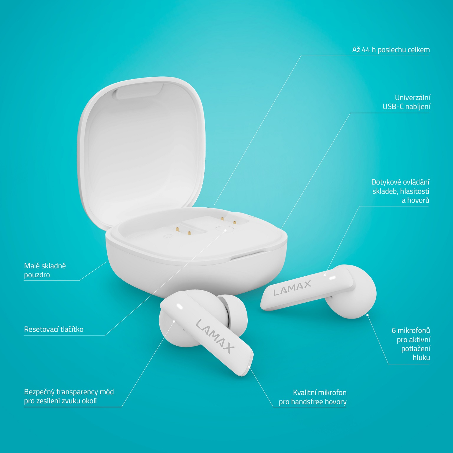 Pokud občas potřebuješ uniknout z reality všedních dnů do svého vlastního světa, pak jsou pro tebe LAMAX Clips1 ANC tou nejlepší volbou. Bezdrátová špuntová sluchátka jsou vybavena špičkovým hybridním ANC pro dokonalý potlačení okolního hluku, aby tvůj poslech nic nerušilo. Jakmile ale potřebuješ vnímat dění kolem sebe, přichází na scénu Transparency mode. Poslouchat můžeš nerušeně až 10 hodin a dalších 34 hodin ti poskytne pouzdro. Pro dobití pak slouží USB-C kabel. Sluchátka se automaticky spárují s tvým zařízením, a to bleskově díky Bluetooth 5.3. O dokonalou kvalitu a čistotu zvuku se postará kodek AAC a lepší požitek z her a filmů poskytuje low latency Herní mód. Vše ovládáš dotykově na sluchátkách a při telefonování oceníš kvalitu zabudovanýho mikrofonu. Sluchátka podporují taky hlasový asistenty.