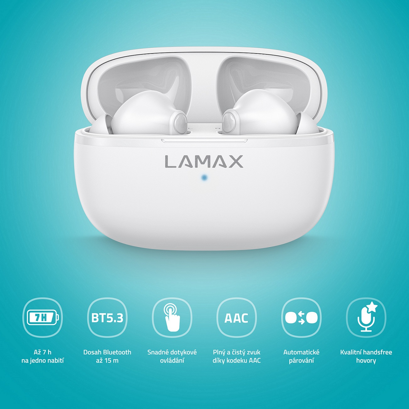 Funkce: Podpora hlasových asistentů (Siri, Google Assistant, ovládání skladeb (přehrát/pozastavit, další/předchozí skladba), ovládání hlasitost, integrovaný mikrofon (ovládání telefonních hovorů - přijímání / odmítání a ukončení hovoru), možnost používání pouze jednoho sluchátka, LED indikace, ergonomická konstrukce, odolné proti potu a vlhkosti.