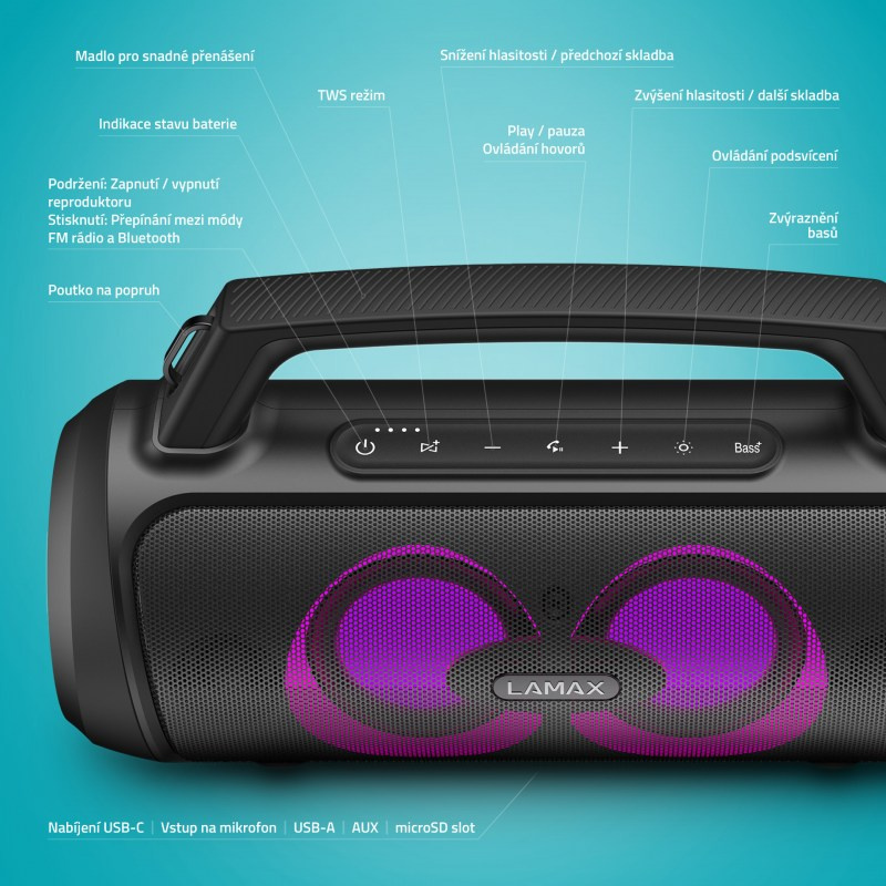 Přenosný Bluetooth party reproduktor s madlem, BT 5.3, výkon 50 W, 3 režimy LED podsvícení, 15 hodin výdrž, ovládání přes zařízení s iOS nebo Android, drátový mikrofon v balení, LAMAX BeatBass®, FM rádio, 3,5 mm jack, SD karta, USB-A vstup, funkce powerbanky, TWS funkce pro připojení druhého reproduktoru.