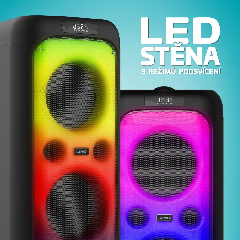 Stačí jeden pohled na reproduktor LAMAX PartyKing1 Plus a je to jasné: tento reproduktor si získá pozornost a po prvním úderu není pochyb o tom, kdo je králem večírků. Tento reproduktor v sobě skrývá vše, co budete potřebovat k tomu, abyste jakoukoli sešlost povýšili na nezapomenutelný zážitek. A je chytrý tah pozvat i sousedy, protože 100 W dvoupásmové reproduktory poskytují tak čistý a silný zvuk, že si jistě získají pozornost všech. PartyKing1 Plus není jen o hlasitosti; podporuje řadu formátů a vstupů včetně FM rádia, čímž zajišťuje, že uspokojí všechny hudební nadšence, ať už pořádáte rodinnou akci, nebo potřebujete dokonalý soundtrack na cvičení. Nastavitelný ekvalizér vybavený technologií BeatBass® zajišťuje ten správný zvuk a vytváří dokonalou rovnováhu, kterou doplňuje až 8 LED efektů pro přizpůsobení náladě. Bluetooth 5.3 zajišťuje bezproblémové připojení a nabízí až 14 hodin přehrávání na jedno nabití. Chcete víc? Pyšní se také LED displejem, funkcí True Wireless Stereo a možností snadného připojení kytary a mikrofonu, díky čemuž je připraven na jakékoli vystoupení nebo karaoke - a vše můžete nahrávat.