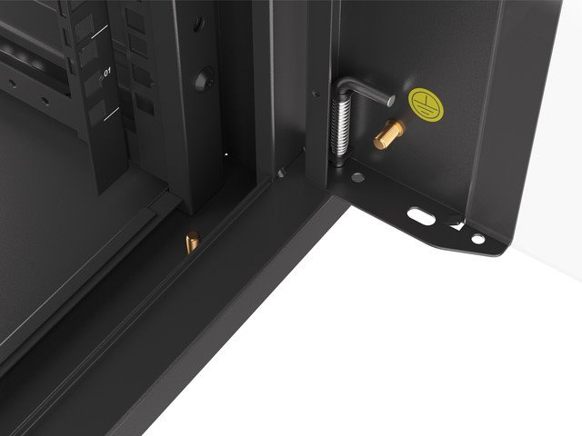 - Přední dveře: odnímatelné, s uzemněním a možností montáže a otáčení až o 180° na obě strany, vybavené 5 mm silným tvrzeným čelním sklem a pevným zámkem,