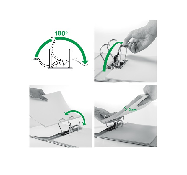 Unikátní patentovaná páková mechanika s otevřením o 180°, která umožňuje o 50 % širší otevření a o 20 % rychlejší práci s pořadačem