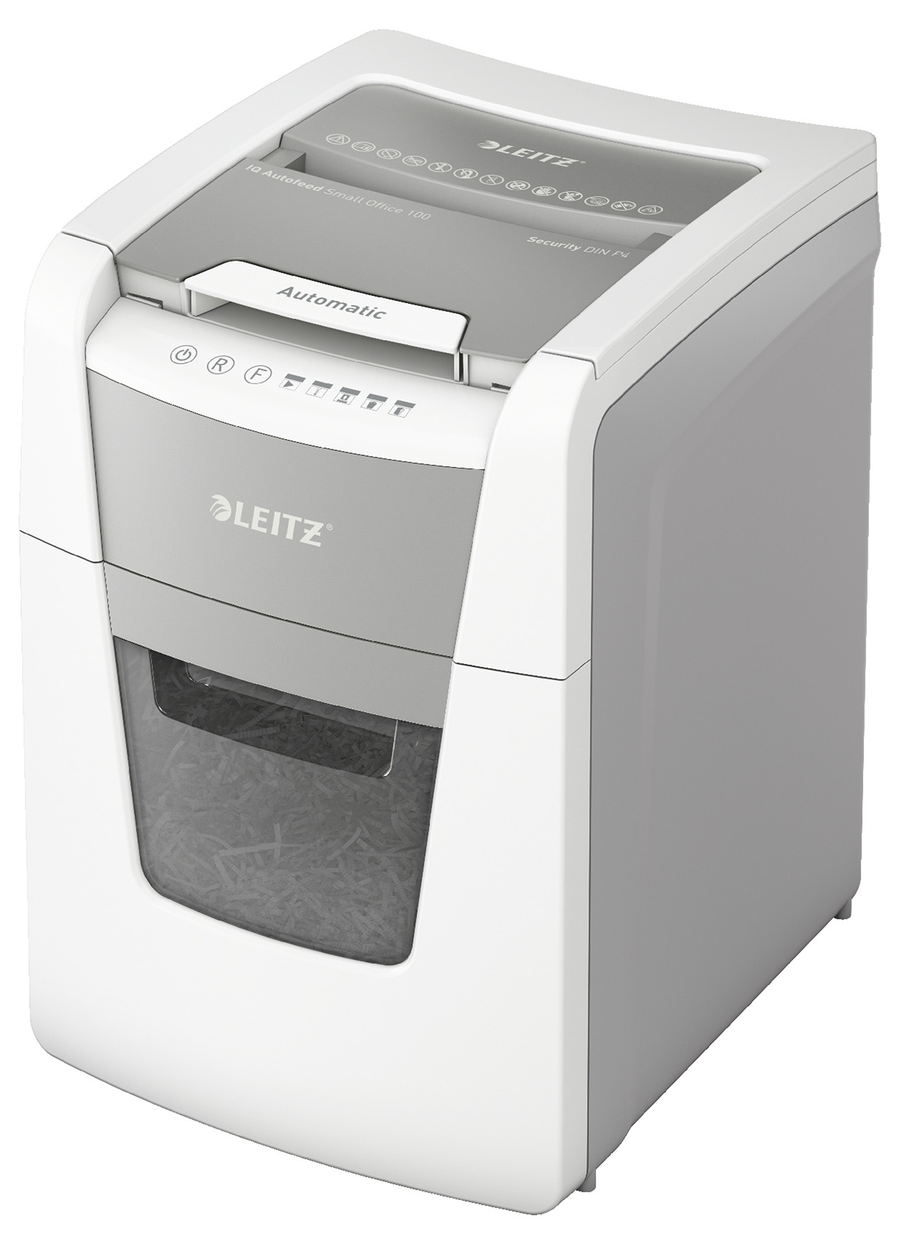 Plně automatická skartovačka papíru od firmy Leitz s jedinečnou čistou vyprazdňovací funkcí. Je tak inteligentní, že tiše pracuje sama, jen vložte stoh papíru (včetně sponek a svorek), zavřete víko a jděte si po své práci. Ideální pro použití v malé kanceláři. Důvěrná bezpečnost a vynikající výkon s touto skartovačkou s automatickým podáváním, s funkcí proti zaseknutí papíru, tichou a s dlouhým provozem (20 minut). Automaticky skartuje 100 listů A4 s úrovní zabezpečení P4 (4x28 mm) s křížovým řezem do velkého koše s objemem 34 l. Jednoduché ovládání pomocí dotekových prvků.