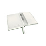 Prémiový zápisník s tvrdými deskami. Formát A5, čtverečkovaný. Uzavírání na gumičku, úchyt na propisku a vnitřní kapsy na volné papíry.