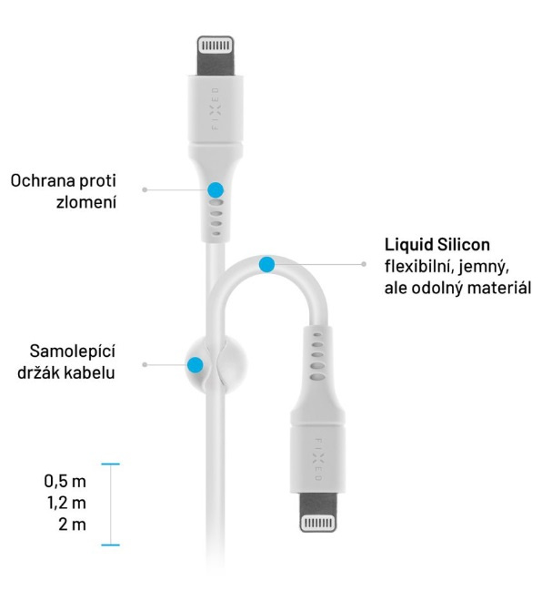 Datový a nabíjecí kabel FIXED Liquid Silicone v praktické prodloužené verzi s konektory USB-C a Lightning je ideálním doplňkem pro vaše Apple zařízení. Slouží pro nabíjení iPhonu nebo iPadu s Lightning konektorem maximální rychlostí, zároveň zvládá přenos hudby, fotografií a veškerých dat rychlostí 480 Mbps. Ochranný plášť kabelu je vyrobený ze speciálního materiálu s názvem Liquid Silicone. Díky tomu je kabel FIXED mnohem odolnější a ohebnější než běžné kabely, nezamotává se a je jemný na dotek. Bezchybnou spolupráci s Apple zařízeními zaručuje certifikace MFi (Made for iPhone / iPod / iPad). V balení najdete i praktické doplňky - stahovací pásek pro snadný transport kabelu a nalepovací organizér, kterým zafixujete kabel na zvoleném místě.