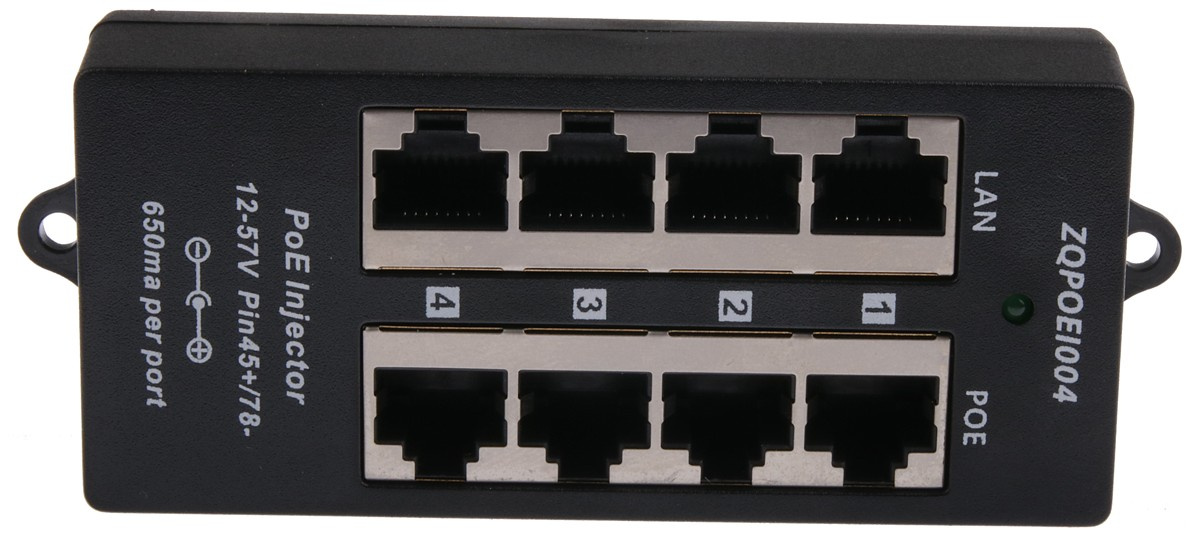 POE-BOX4 je pasivní PoE injektor, který je vhodný pro napájení až 4 zařízení. Do konektorů s označením "LAN" se připojují ethernetové porty bez napájení např. switch, na opačnou stranu "POE" se připojují zařízení využívající pasivní PoE - napájení po eth. kabelu. K napájení se využívají dva volné páry ethernetového kabelu: 4,5 (kladný pól) a 7,8 (záporný pól). Napájení se připojuje standardním napájecím konektorem o velikosti 2.1/5.5mm.