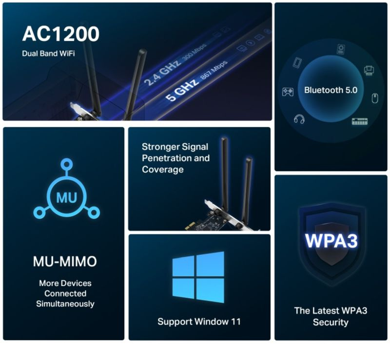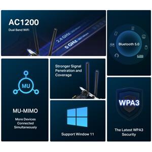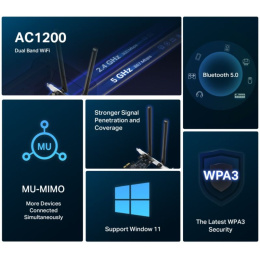 Mercusys MA30E je interní PCIe dual band WiFi a Bluetooth 5.0 adaptér vybaven technologii WiFi5 s rychlostí až 867 Mb/s v pásmu 5GHz a 300 Mb/s v pásmu 2,4GHz s podporou MU-MIMO. O bezpečnost přenášených dat pečuje technologie WPA-PSK/WPA2-PSK/WPA3-SAE. Adaptér je plně kompatibilní s operačním systémem Windows 10,11 (64 bit).