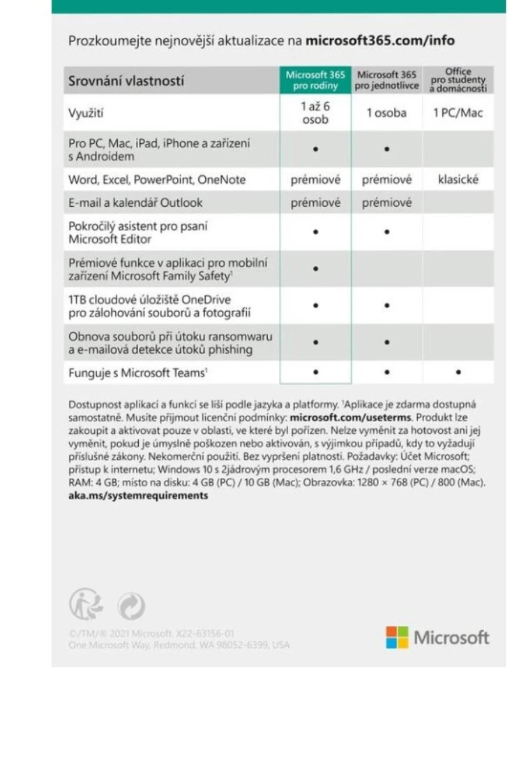 Microsoft 365 Family. Roční předplatné pro až 6 osob, kompatibilní s Windows i macOS. Obsahuje prémiové aplikace Office a rozšířené cloudové služby.