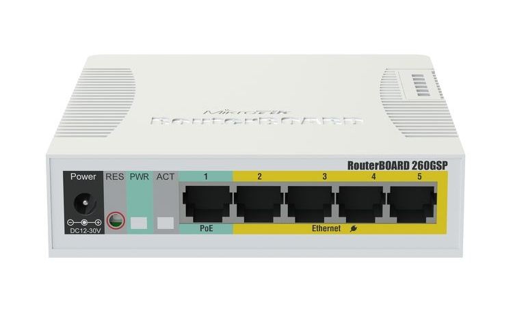 RouterBOARD RB260GSP je 5-ti portový gigabitový web management smart switch běžící na novém proprietárním softwarovém řešení Mikrotiku SwOS.