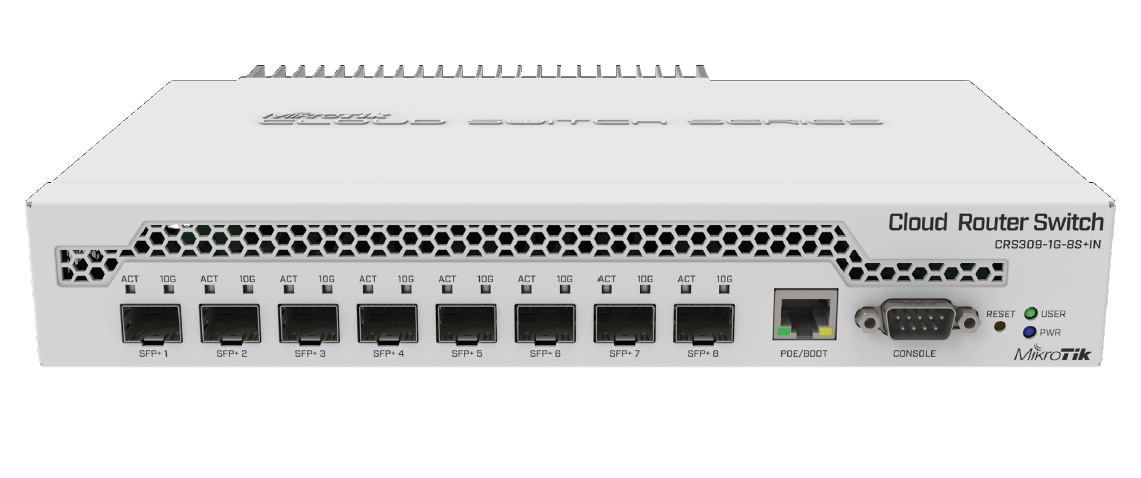 Cloud Router Switch CRS309-1G-8S+IN je operačním systémem SwOS či RouterOS poháněný 8-portový switch s osmi SFP+ šachtami a jedním management ethernet portem v desktop provedení.