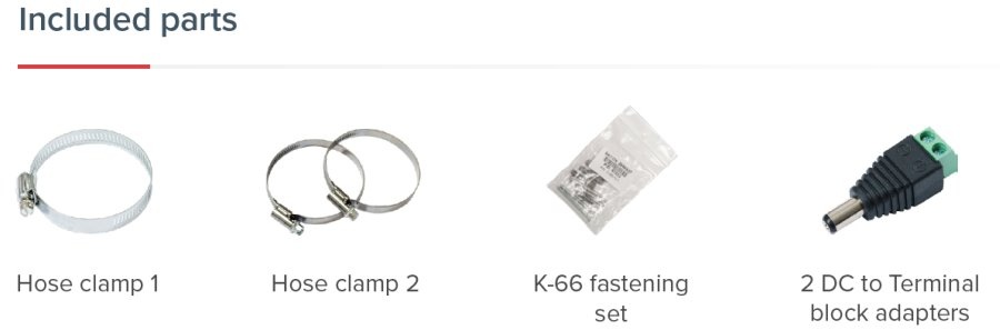 Součástí balení jsou pásky k uchycení na sloup a napájecí redukce.
