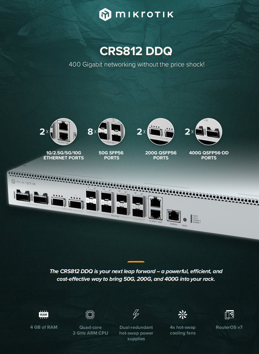 CRS812 DDQ představuje novou generaci síťových switchů s podporou 400 Gigabit Ethernet za dostupnou cenu. Vybaven moderním Marvell switch chipem 98DX7335 a výkonným quad-core ARM procesorem AL52400 s frekvencí 2 GHz, poskytuje pokročilé routing, switching a traffic management funkce známé z milionů RouterOS nasazení.