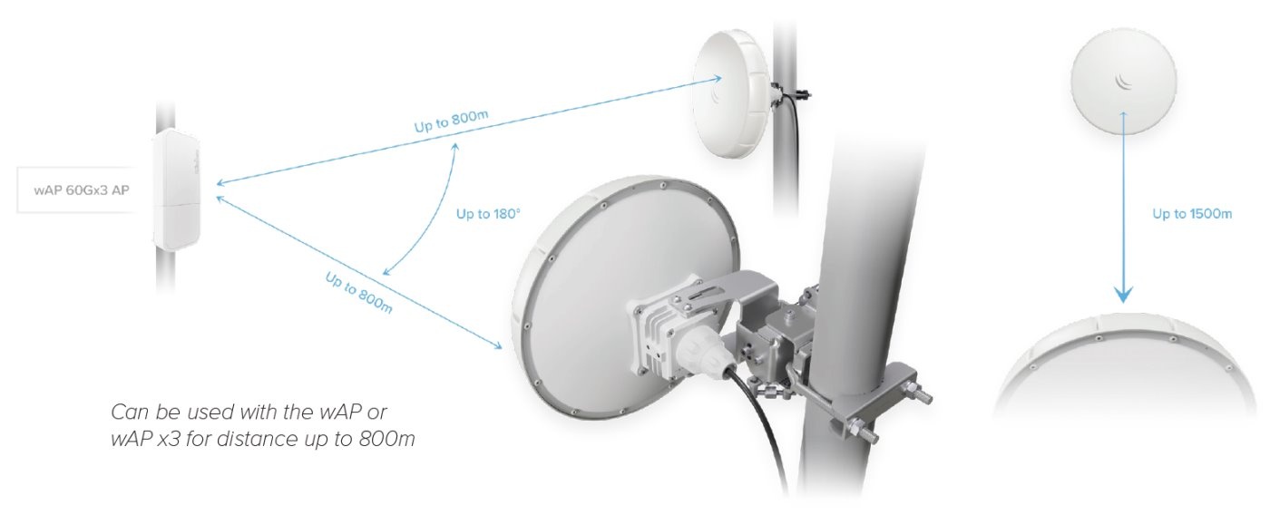 nRAYG-60adpair je další revoluční novinka v MikroTik sortimentu, která osloví každého, kdo vytváří spoje na středně dlouhé vzdálenosti. Jedná se totiž o ptp řešení v pásmu 60GHz pracující se standardem 802.11ad, který v reálném provozu umožňuje propustnost až 1000Mbps Full Duplex na vzdálenost až 1500m. MikroTik tvrdí, že má tato jedotka stejný zisk jako jednotky LHG (RBLHGG-60ad) ale s menší velikostí a radomem jako bonus, který uvítají všichni ISP za nepříznivého počasí. RouterBoard je jako vždy vybaven velmi oblíbeným operačním systémem RouterOS s L3 licencí. Pro upgrade jednotky na AP je potřeba dokoupit pouze L4 licenci.