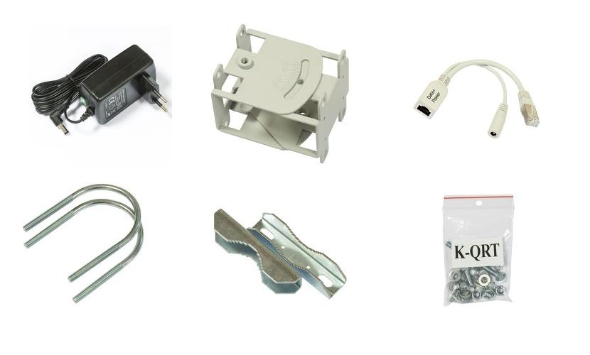 • QRT wireless device, precision mounting bracket, U bolts, pole clamp, screw kit, 24V 0.8A power adapter, Gigabit PoE injector