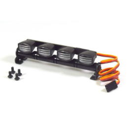 Světelná rampa 4x LED Multifunkční světelná rampa včetně bílých LED, napájení 4,8 - 6V, konektor JR. Vlastní rampa je kovová, paraboly jsou plastové. Rampu je možné ovládat třetím kanálem pomocí integrovaného elektronického spínače nebo mikrospínačem umístěným v zadní části rampy. Rampa má 6 světelných režimů: 1. zhasnutá, 2. trvale svítí, 3-6 reflektory různě problikávají. Postupným stlačením mikrospínače se cyklicky pohybuje mezi těmito režimy. Stejně se rampa dá ovládat třetím kanálem z vysílače, stačí jen zapojit do volného konektoru v přijímači a postupným spínání ovladače třetího kanálu se pohybovat mezi jednotlivými světelnými režimy. Sklon reflektorů na nosné tyči lze měnit. RozměryDélka (mezi otvory v patkách) 105mmVýška 30mmRozměr reflektoru 18x14mm