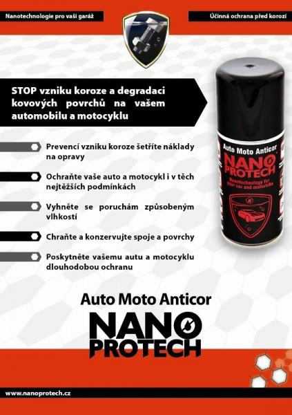 Nanoprotech Auto Moto AnticorO Nanoprotech Auto Moto Anticor:Sprej Nanoprotech Auto Moto Anticor je pečlivě vyladěn pro použití v automobilovém průmyslu. Na povrchu ošetřeného materiálu se formuje tenká vrstva z nanočástic, která se fyzikálními silami váže na materiál a tvoří neproniknutelnou a vodoodpudivou vrstvu chránící povrch před vlhkostí.NANOPROTECH Auto Moto Anticor byl vyvinut s ohledem na náročné podmínky použití a provozování automobilů a motocyklů a efektivně je chrání v širokém rozsahu teplot a tlaků. Konzervační roztok proniká díky extrémně nízkému povrchovému napětí do mikrotrhlin a pórů materiálu a vytěsňuje z nich všechnu vlhkost. Ochranná vrstva působí po dobu až jednoho roku a zabraňuje korozi a degradaci povrchu materiálu. Princip působení nanotechnologie a důvod výjímečností spreje Nanoprotech:Bez ošetření se vlhkost v mikrotrhlinách usazuje a způsobuje korozi a degradaci povrchu.NANOPROTECH proniká do nerovností a mikrotrhlin a 100% vytěsňuje vlhkost.Pevná a pružná ochrana působí po dobu až 1 roku!Návod použití:Sprej pečlivě protřepejte a nanášejte souvislou vrstvou na určený povrch ze vzdálenosti 20 – 30 cm. Po aplikaci vyčkejte 10 až 15 minut k úplnému proniknutí roztoku do mechanismu. Sprej používejte v dobře větraných prostorách. Doporučujeme používat ochranné rukavice.Možnosti použití:- Panty, závěsy, kloubové spoje, čepy- Zámky dveří, kufrů, kapot- Šrouby, matky- Závěsná a tažná zařízení- Gumová těsnění dveří a provozních otvorůSpotřeba:Spotřeba jednoho spreje Nanoprotech je přibližně 50 ml / 1m2Složení:Výrobek Nanoprotech obsahuje vysoce čisté minerální oleje, antikorozní přísady, antioxidanty, dezodorizovaný parafín, naftenové uhlovodíky, tajnou recepturu NANOPROTECH, propan butan.Vyrobeno v EUObsah 150 ml