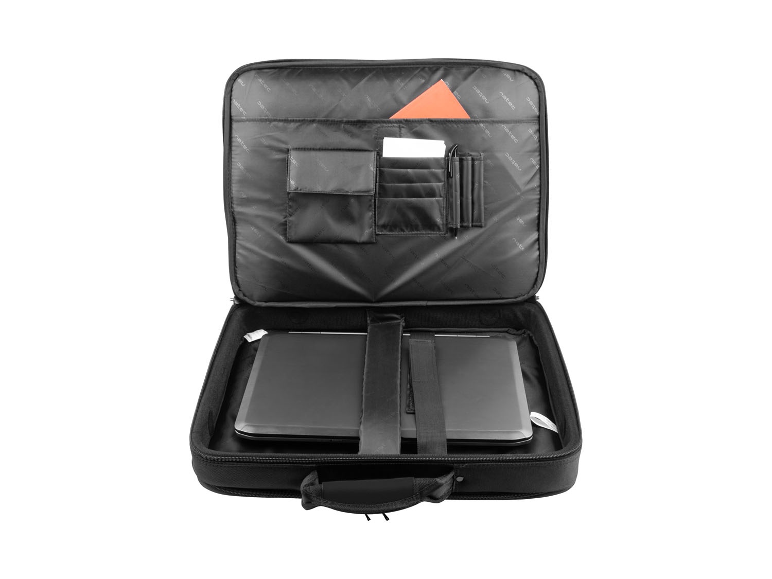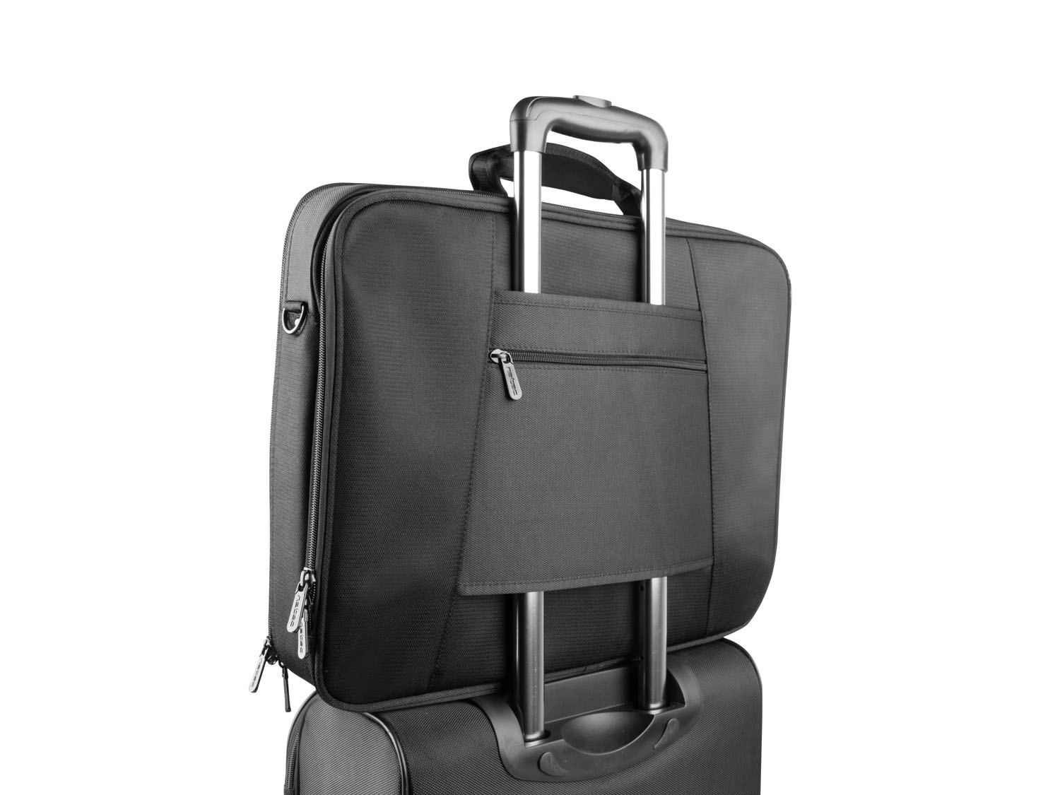 Hlavní přihrádka je vybavena zapínáním na suchý zip, zasouvací částí na dokumenty a funkčními držáky pro kancelářské doplňky. Dvě další kapsy na zip vpředu poskytují úložný prostor pro kabely nebo předměty, které chcete mít vždy po ruce. Dokumenty lze uložit do prostorné snadno přístupné přihrádky na zip na zadní straně. Malá kapsa na zip na pásu k uchycení ke kufru může sloužit jako místo pro cenné předměty, jako je peněženka nebo mobil.